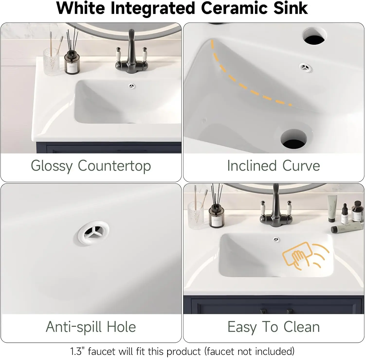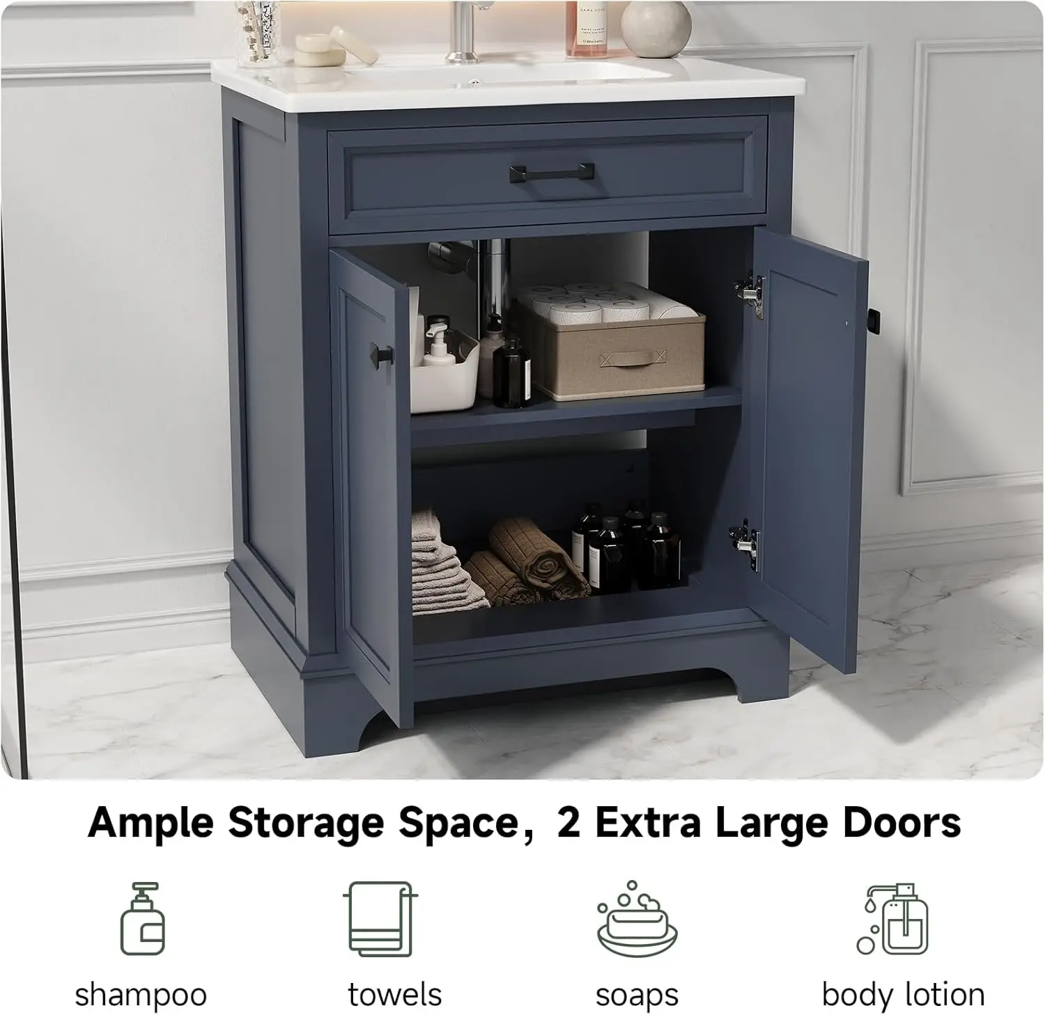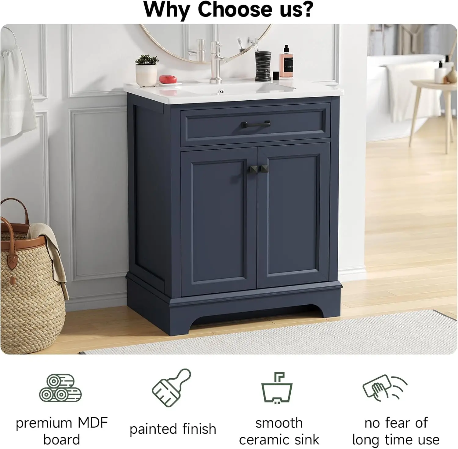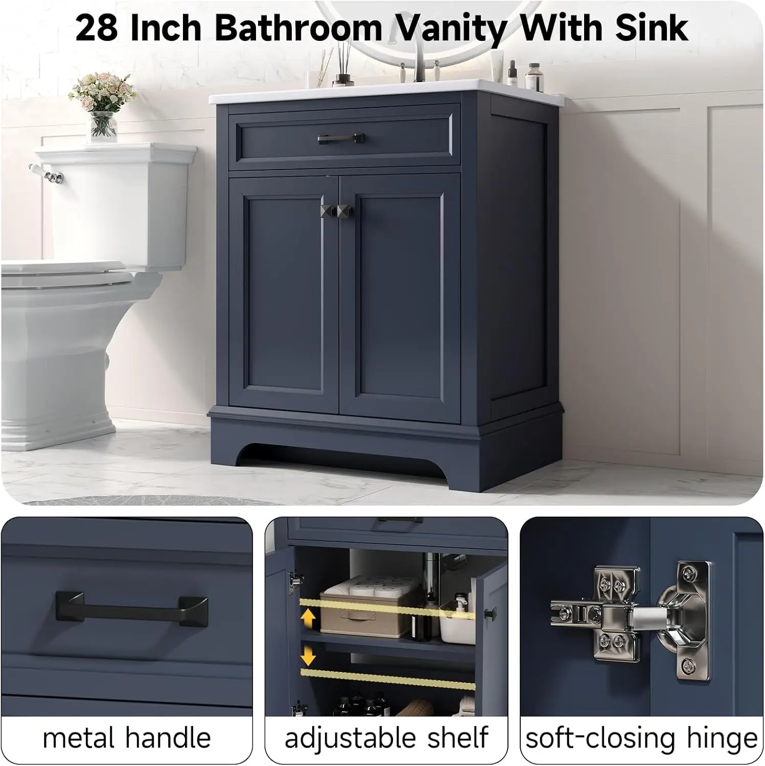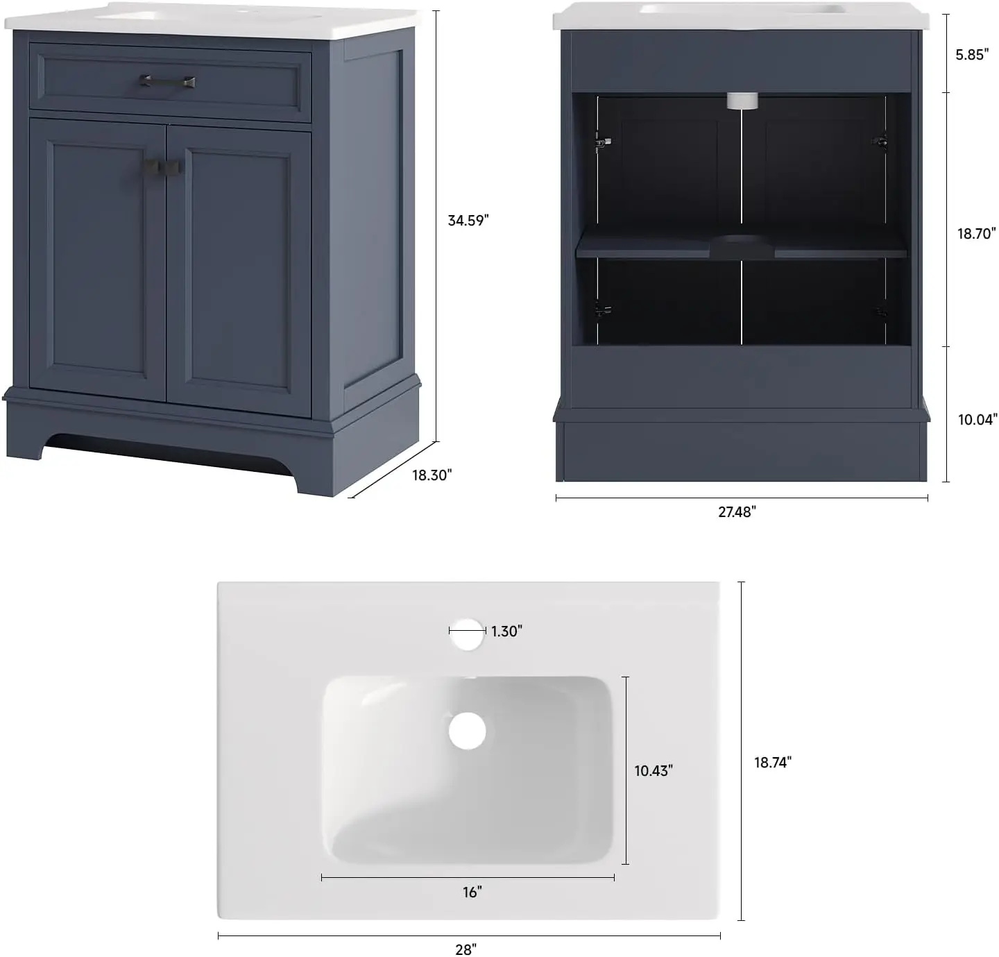 This 28-inch modern vanity sink combines sleek design with everyday functionality. Featuring a ceramic sink, it provides a smooth and durable surface for daily use. The painted finish adds a clean and refined look to your bathroom. Its freestanding structure ensures stability and flexible placement. The storage cabinet offers convenient space for organizing toiletries and essentials. Perfect for maintaining a tidy and stylish bathroom environment. The compact size makes it ideal for small to medium spaces. Its modern aesthetic complements contemporary interiors effortlessly. Crafted for durability, it ensures long-lasting performance and reliability. This vanity is a stylish and practical addition that elevates both organization and bathroom decor.