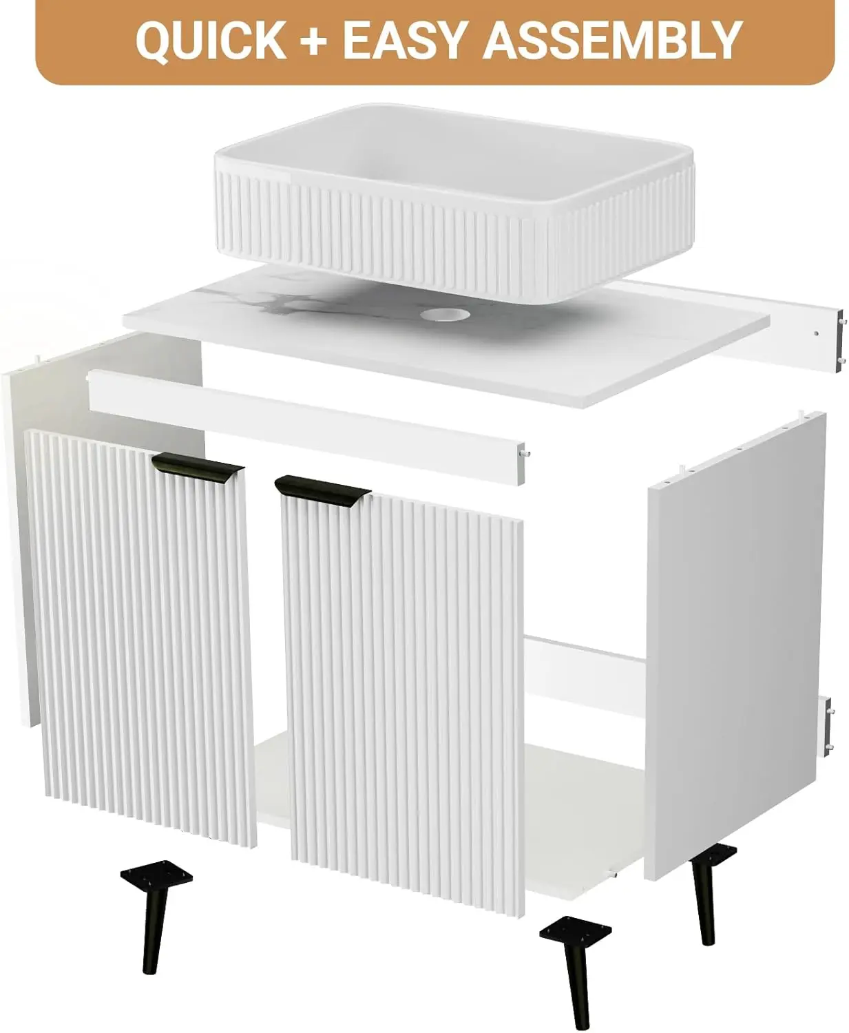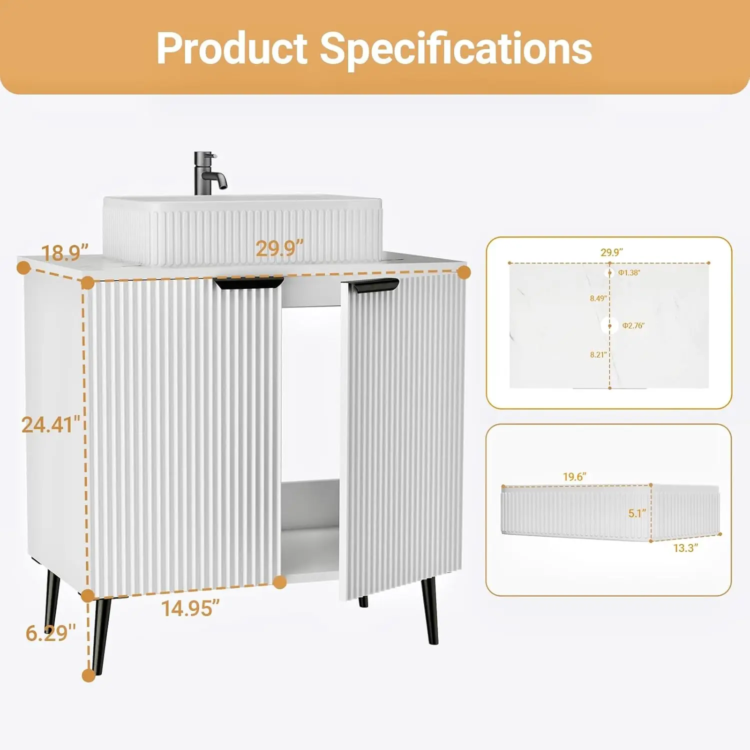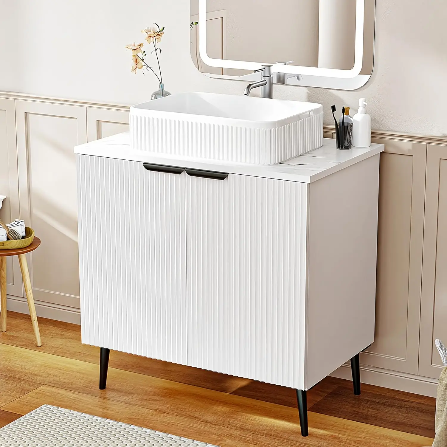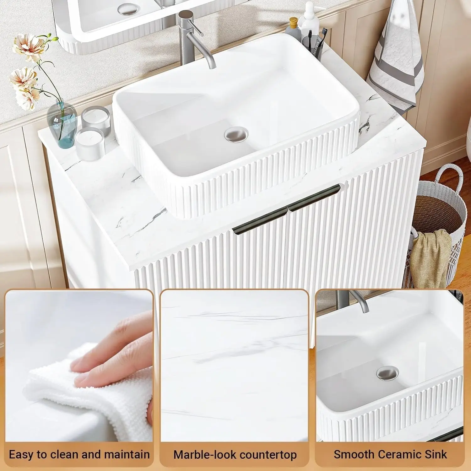This 30-inch farmhouse vanity sink combines modern convenience with rustic-inspired design. Featuring a water-resistant wave door cabinet, it adds texture and durability to your space. The integrated sink creates a clean and functional centerpiece. Designed for tool-free assembly, it can be set up quickly and easily in about 30 minutes. The cabinet provides practical storage for organizing toiletries and essentials. Its freestanding design ensures stability and flexible placement. Perfect for bathrooms, it enhances both organization and style. The farmhouse aesthetic blends seamlessly with modern interiors. Crafted for durability, it ensures reliable everyday performance. This vanity is a stylish and functional addition that elevates your bathroom with convenience and charm.
