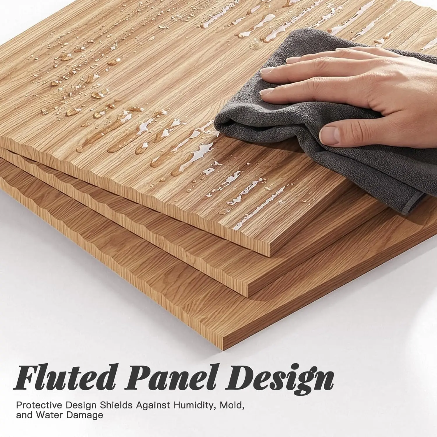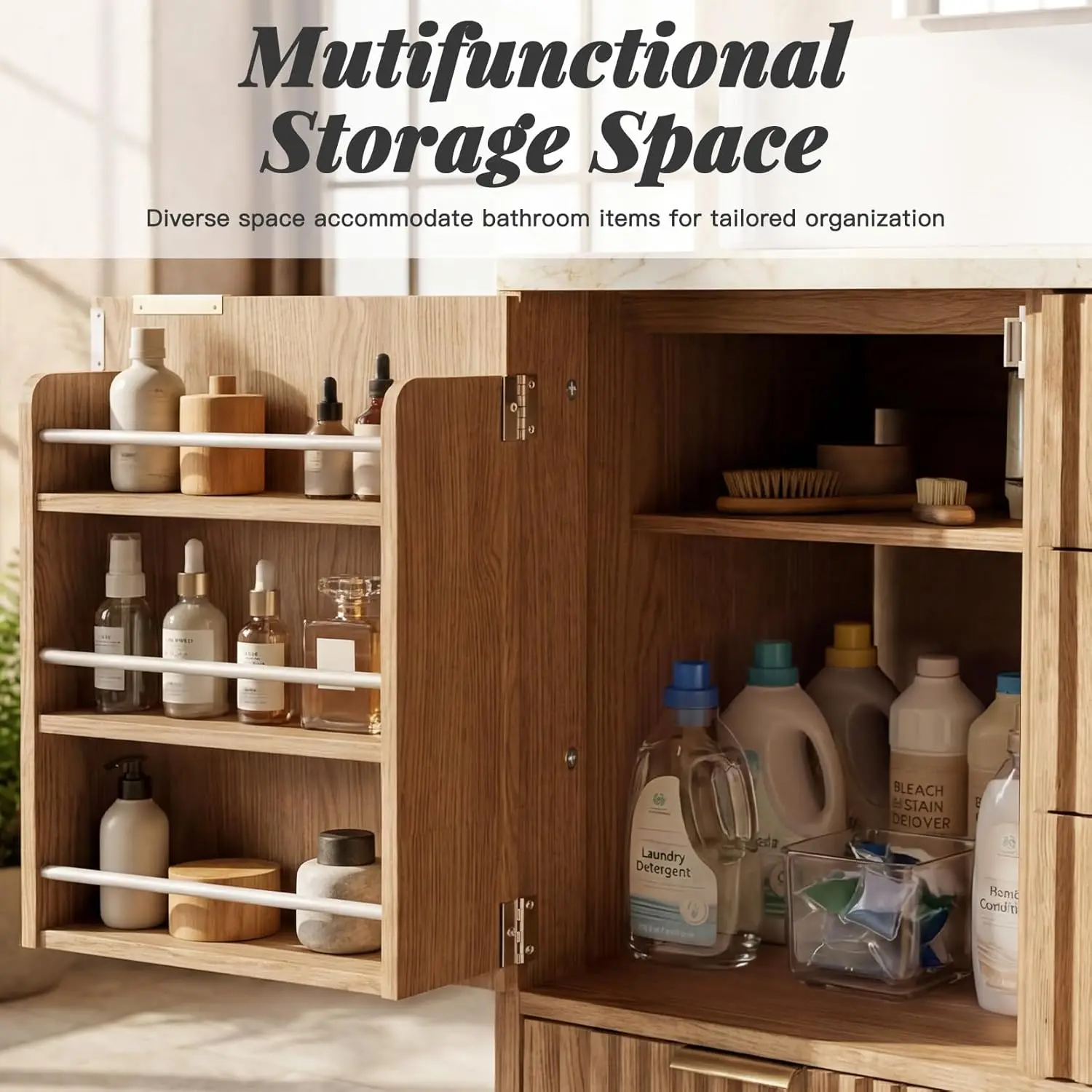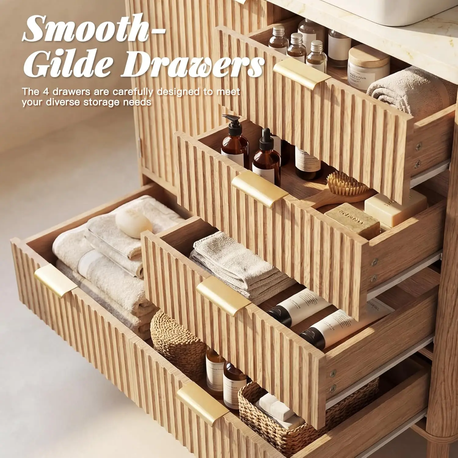 This 31-inch fluted vanity cabinet combines modern elegance with practical storage. Featuring an engineered marble top, it adds a refined and luxurious touch to your bathroom. The fluted detailing enhances texture and visual interest. Four spacious drawers provide ample storage for organizing toiletries and essentials. Its freestanding design ensures stability and easy placement. Perfect for keeping your bathroom clean and clutter-free. The modern aesthetic complements contemporary and minimalist interiors effortlessly. Crafted for durability, it ensures long-lasting performance and reliability. The combination of marble and fluted design creates a sophisticated focal point. This vanity is a stylish and functional addition that elevates both organization and bathroom decor.