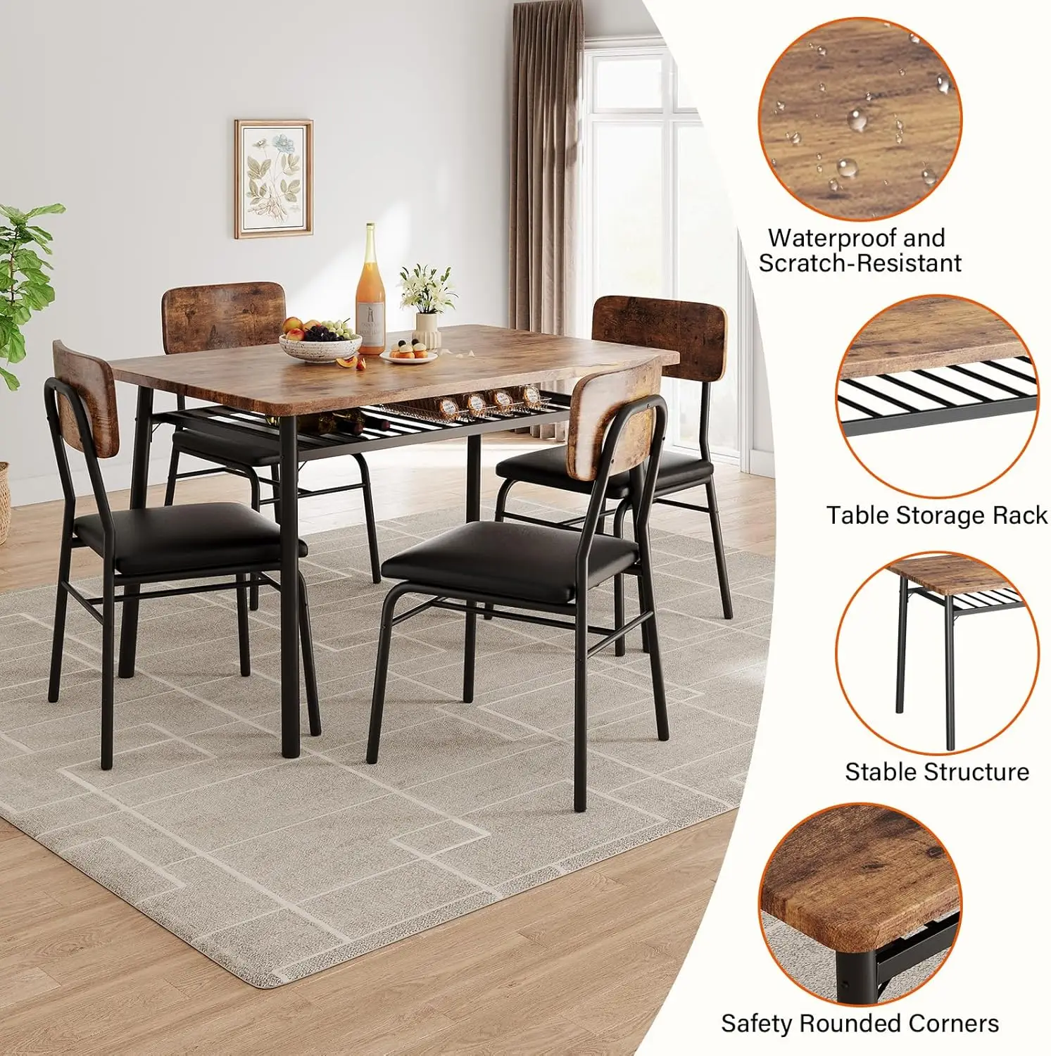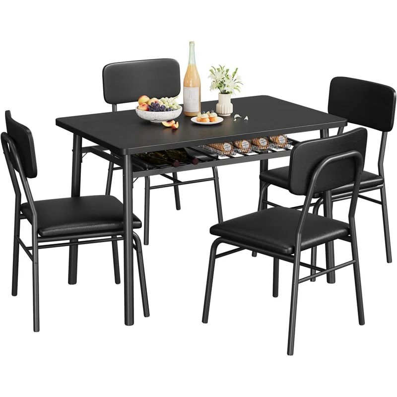 This 5-piece dining set for four combines modern design with everyday functionality. Featuring a wood tabletop, it adds warmth and natural character to your dining space. The metal frame provides durability and a sleek industrial touch. Four upholstered chairs offer comfortable seating for daily meals and gatherings. Perfect for kitchens and dining areas, it fits well in both small and open spaces. The compact design makes it ideal for apartments or cozy dining rooms. Its contemporary style blends effortlessly with modern interiors. Crafted for durability, it ensures long-lasting stability and performance. The combination of wood and metal creates a balanced and stylish look. This dining set is a practical and elegant addition that enhances comfort and home dining decor.