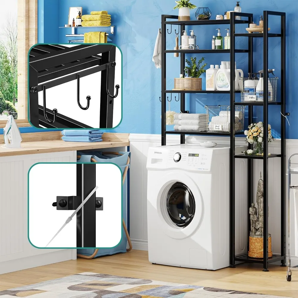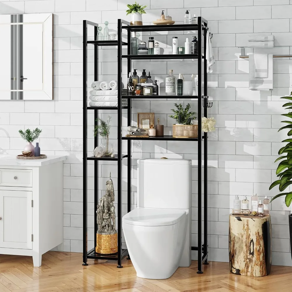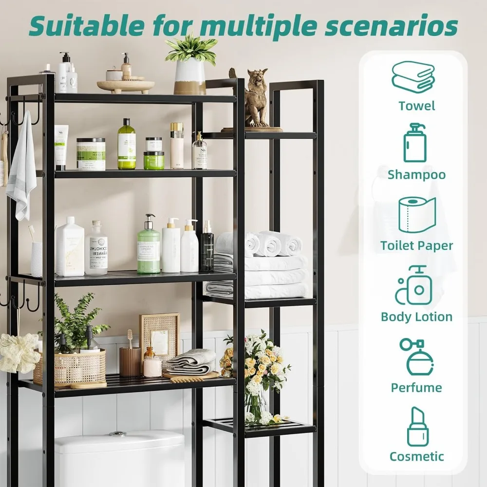 This 8-tier over-toilet organizer offers maximum storage with a sleek and modern design. Built with a durable metal frame, it provides strong and stable support. The multi-tier shelving creates ample space for toiletries, towels, and bathroom essentials. A side rack adds convenient storage for hanging towels and accessories. Designed to fit over the toilet, it efficiently utilizes vertical space. Perfect for small bathrooms, it helps keep your space organized and clutter-free. The black finish adds a bold and contemporary touch. Its open design allows easy access to frequently used items. Crafted for durability, it ensures long-lasting performance. This organizer is a practical and stylish solution that enhances both storage and bathroom decor.