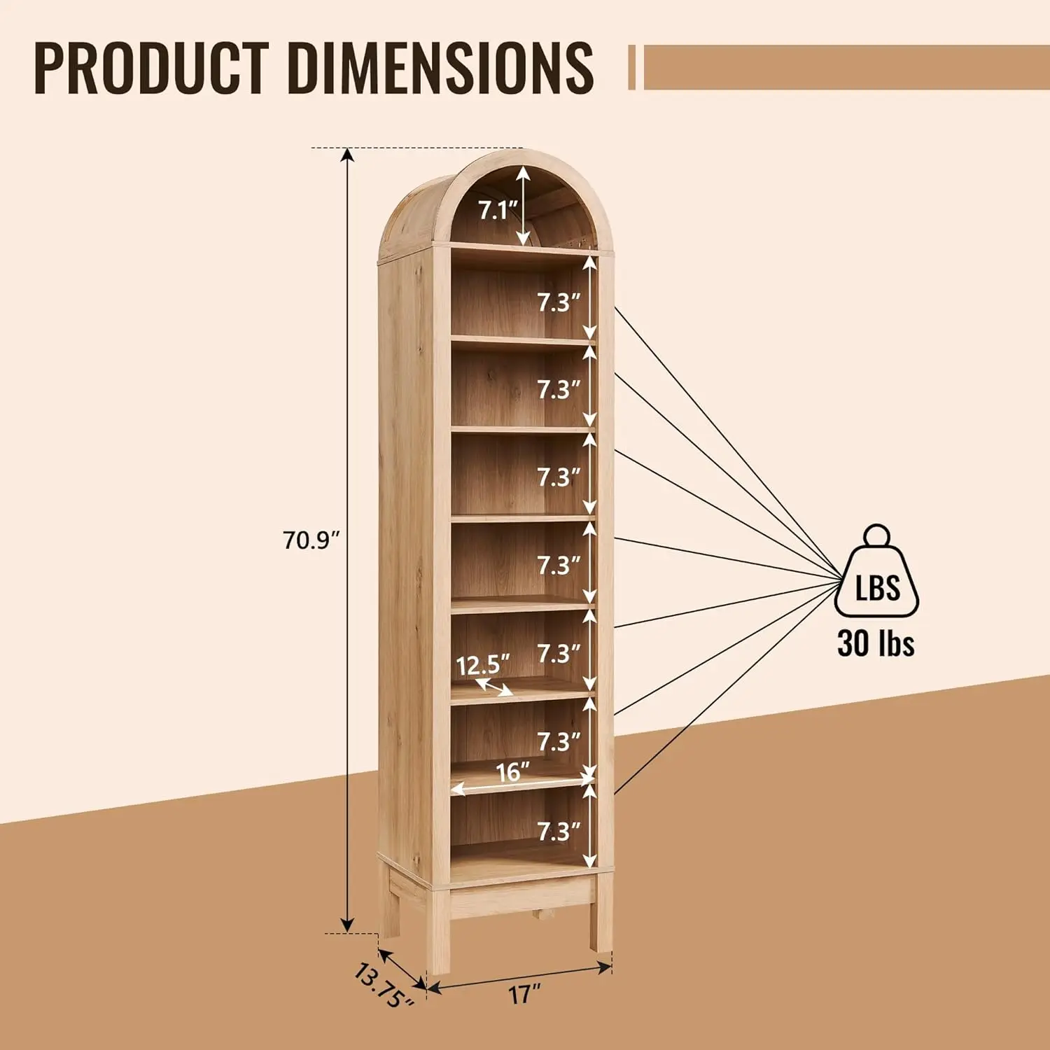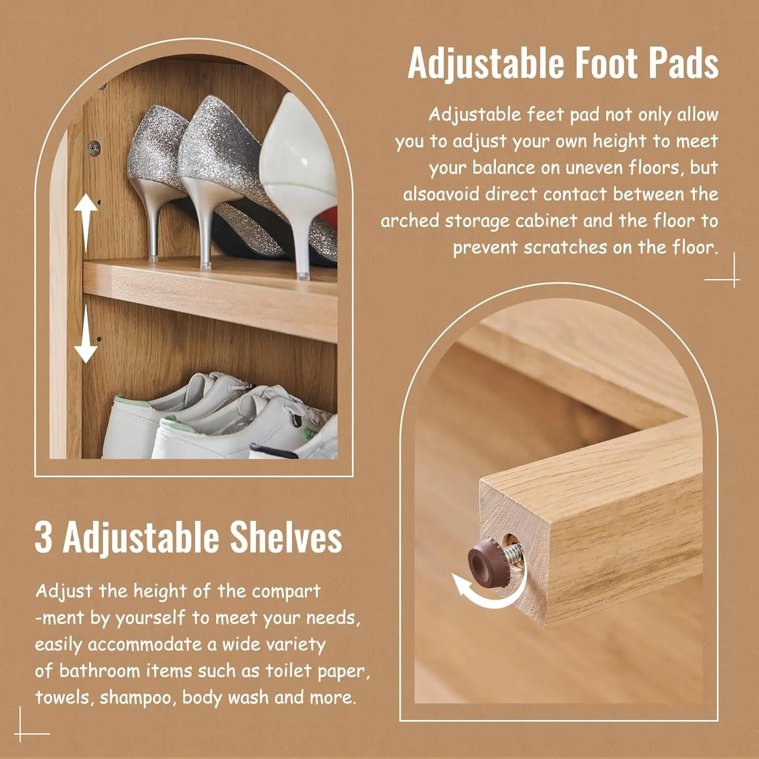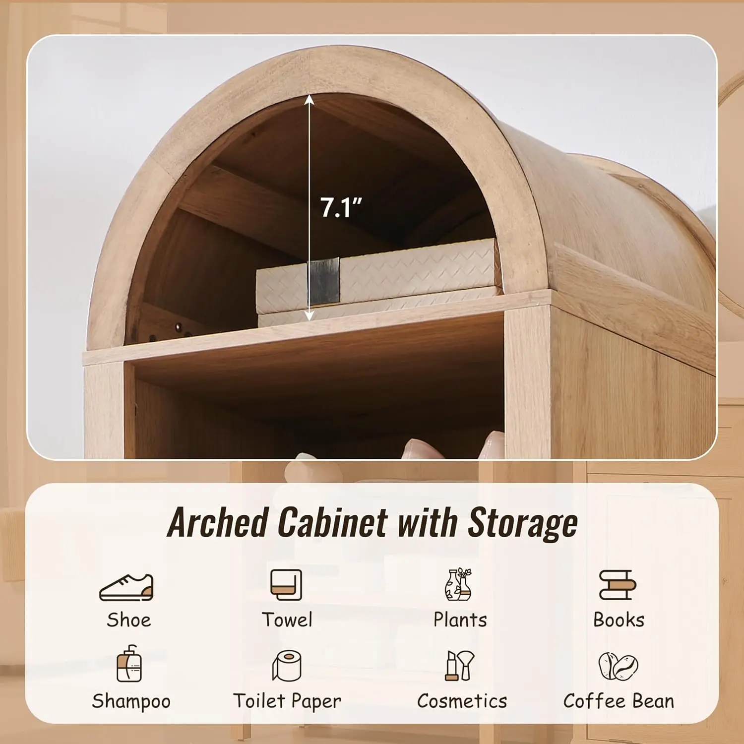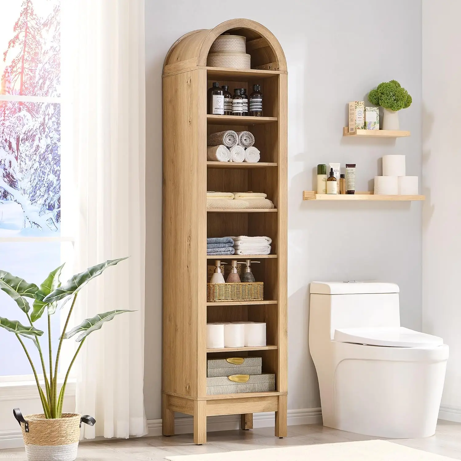 This arched farmhouse storage cabinet blends rustic charm with modern functionality. Standing at 71 inches tall, it offers generous vertical storage for organizing your space. Designed with an elegant arched top, it adds architectural character and visual appeal. The 8-tier layout with adjustable shelves provides flexible storage for items of various sizes. Perfect for bathrooms, living rooms, or kitchens, it keeps essentials neatly arranged. The wood construction adds warmth and durability to your home. Its farmhouse style complements both rustic and contemporary interiors effortlessly. Crafted for long-lasting performance, it ensures reliable everyday use. The combination of open and closed storage enhances both convenience and organization. This cabinet is a stylish and practical solution that elevates your home decor and storage.