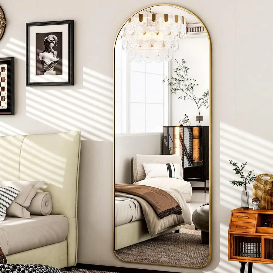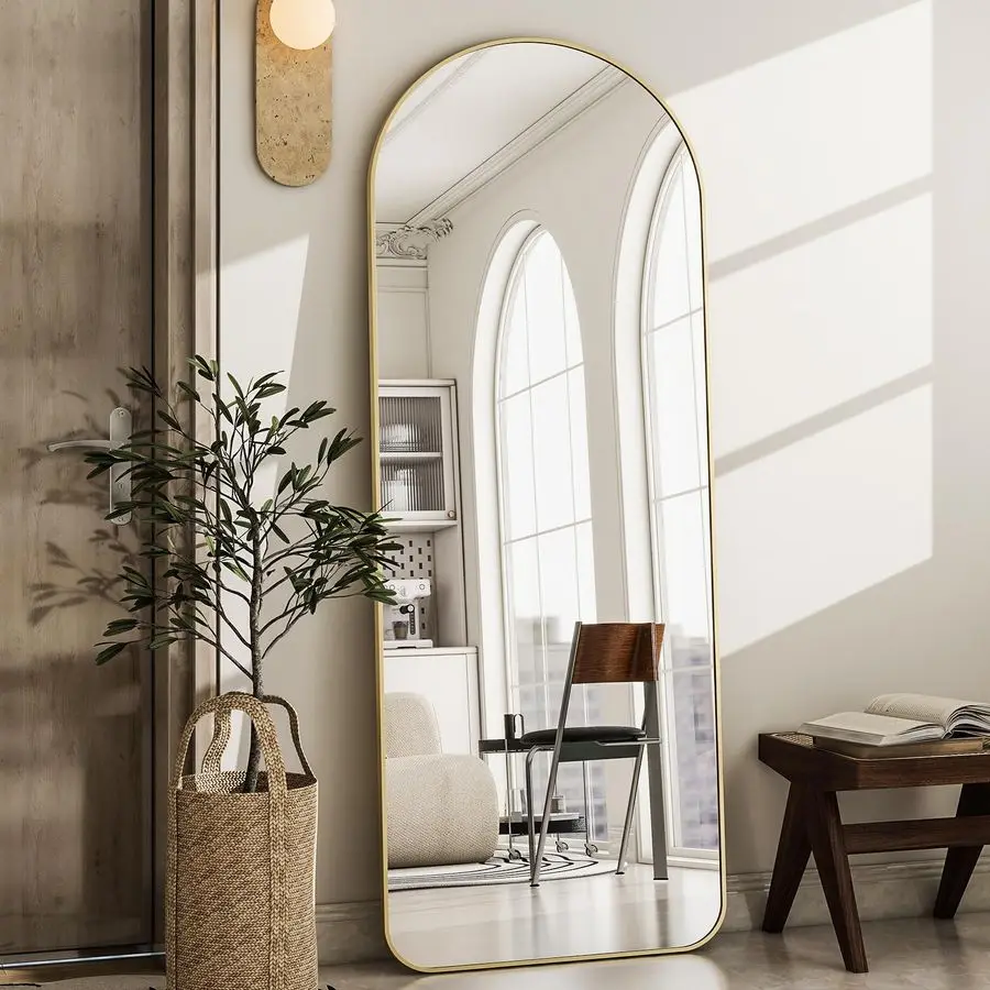 WELCOME TO RESTORATION AND DESIGN This arched full length mirror combines modern elegance with everyday functionality. Measuring 64 by 21 inches, it provides a complete full-body reflection. The smooth arched top adds a soft architectural touch to your space. Crafted with a durable aluminum frame, it offers strength and a sleek finish. Designed with a sturdy stand, it can be easily placed in bedrooms or living rooms. The large reflective surface helps brighten spaces and create a sense of openness. Its minimalist design complements contemporary and modern interiors effortlessly. Built for stability, it ensures reliable and long-lasting use. The versatile style allows it to blend seamlessly into various decor themes. This floor mirror is a stylish and practical addition that enhances both design and daily living.