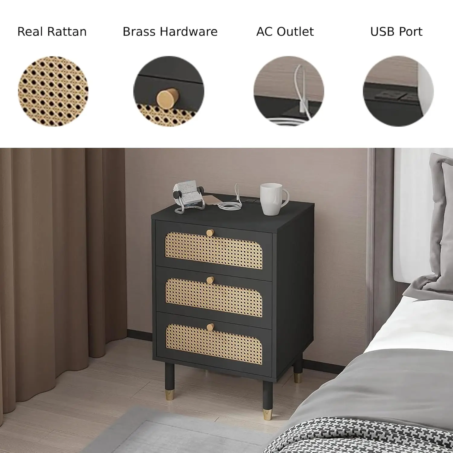 This 27-inch tall black rattan nightstand set blends boho texture with modern sophistication. Designed as a set of two, it creates a balanced and stylish bedroom arrangement. The woven rattan drawer fronts add warmth and natural character. Each nightstand features three spacious drawers for organized storage. Built-in charging stations provide convenient power access for devices. The sleek black finish offers a bold and contemporary contrast. Perfect for bedrooms, it keeps essentials neatly stored and within reach. Its tall structure maximizes vertical storage without overwhelming the space. Crafted for durability, it delivers long-lasting function and support. This nightstand set is a refined furniture choice that combines practicality, texture, and modern design effortlessly.