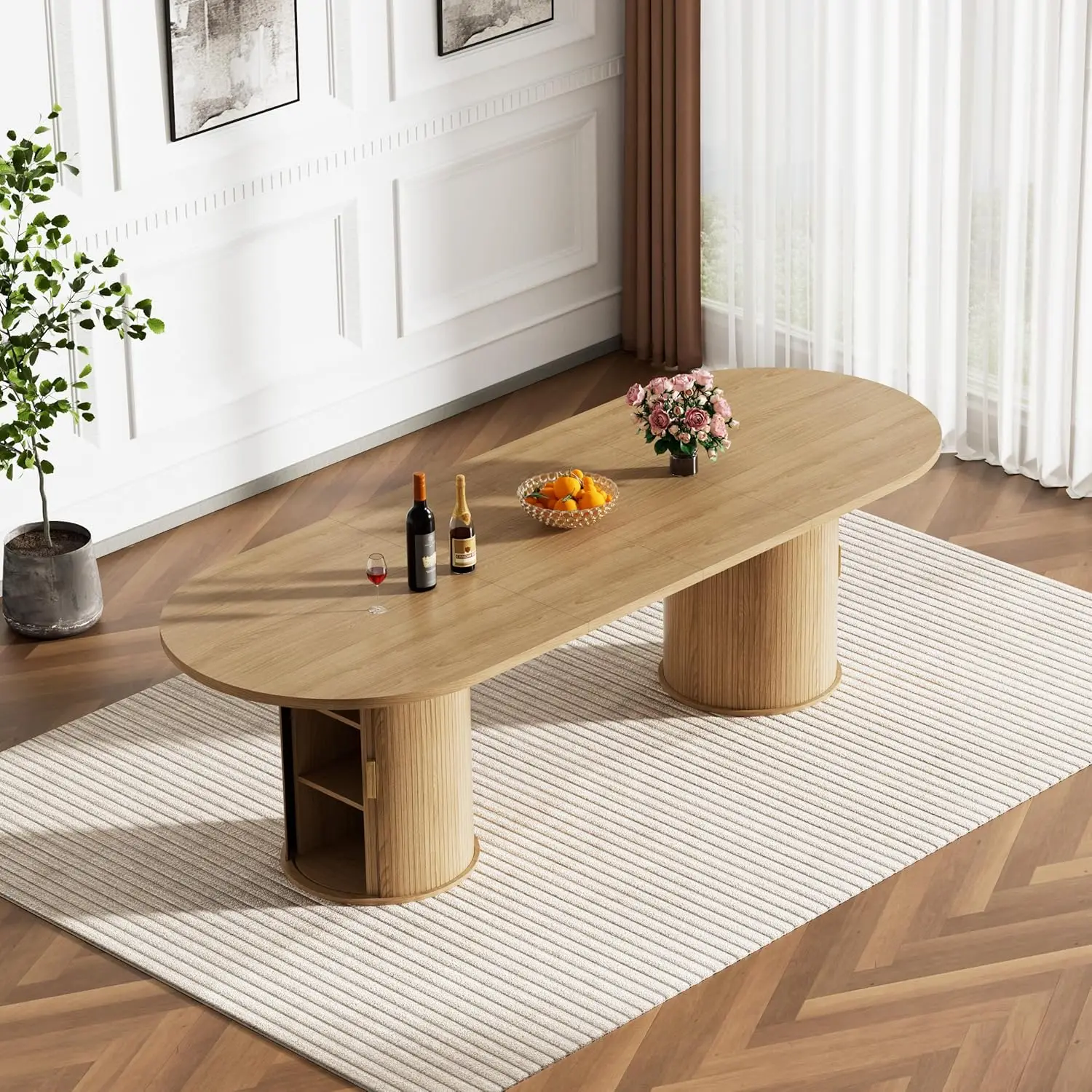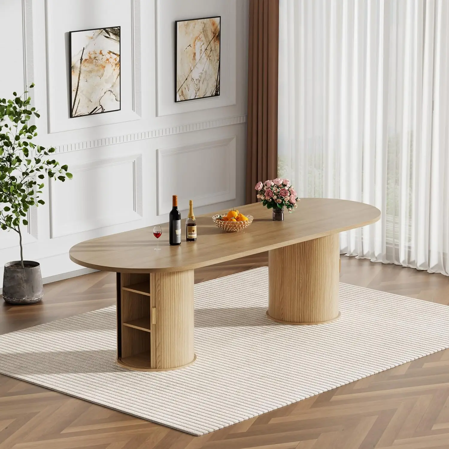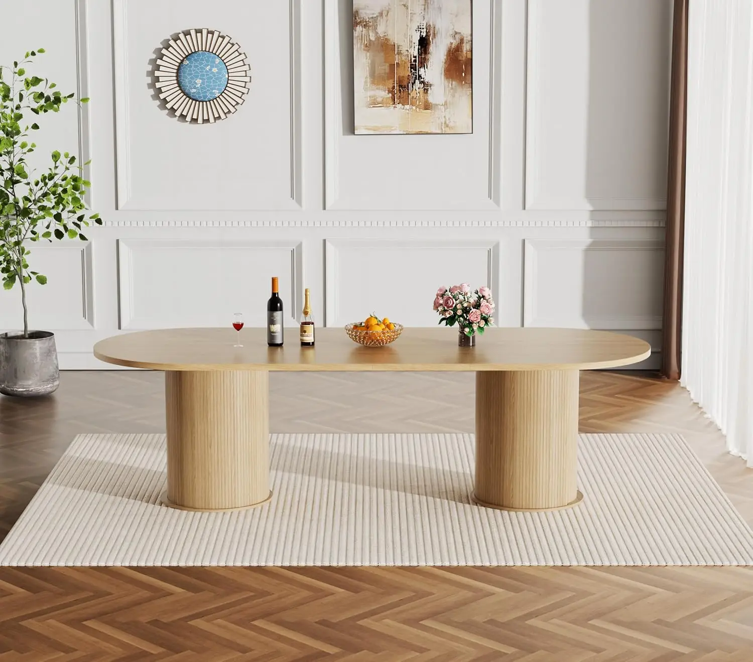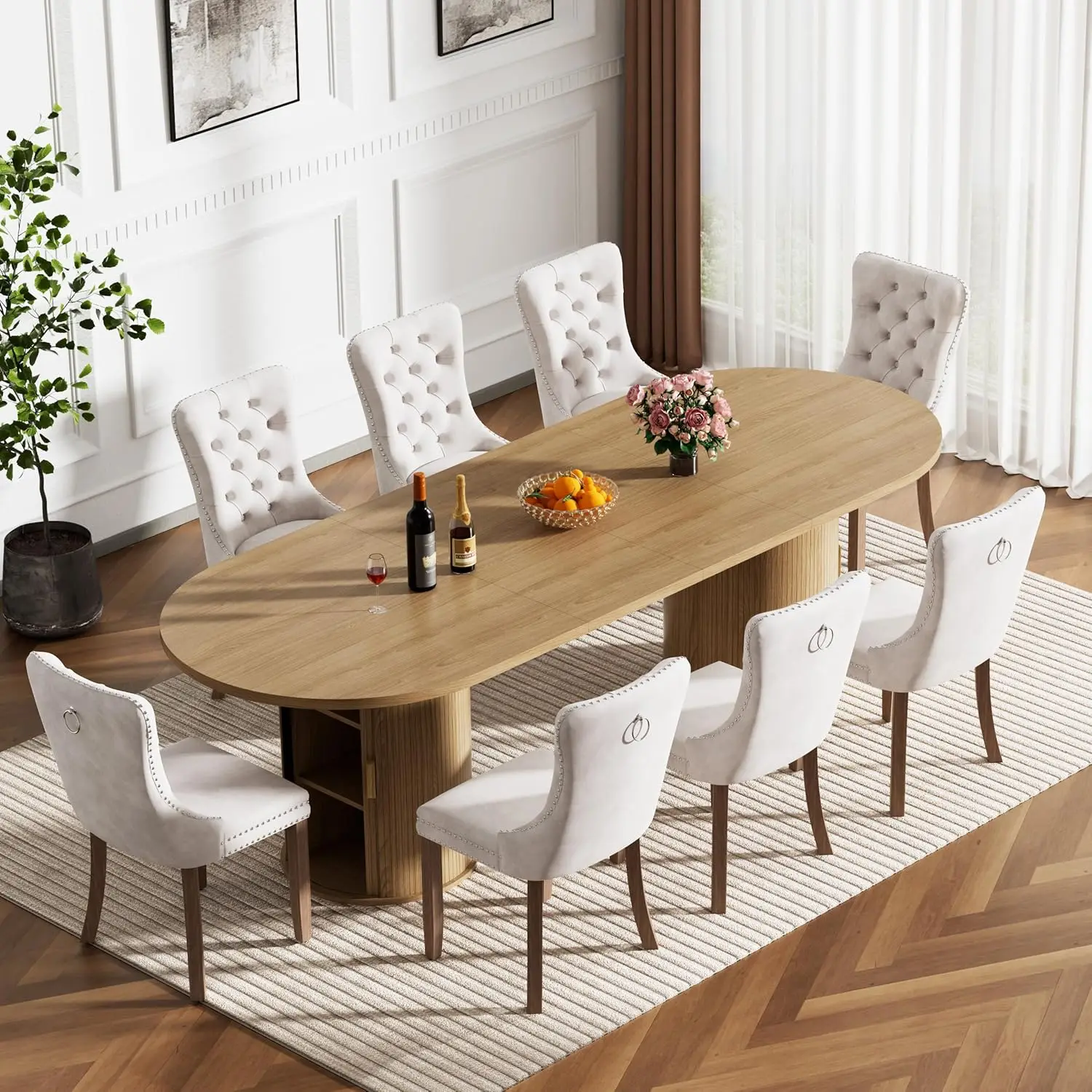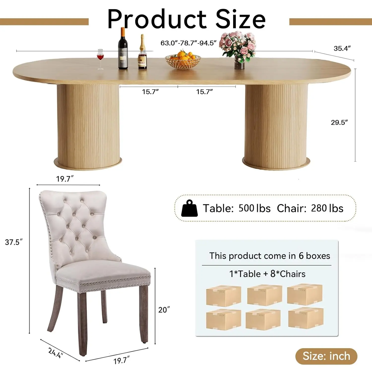 This extendable 8-seat dining set combines versatility with elegant design. Featuring a wooden dining table that expands from 62.99 to 94.5 inches, it adapts to both everyday meals and larger gatherings. The spacious tabletop provides ample room for comfortable dining. Eight beige velvet chairs add a luxurious touch with soft and supportive seating. Wooden legs enhance stability while complementing the natural look. Perfect for dining rooms, it creates a welcoming space for family and guests. The extendable feature offers flexibility for different occasions. Its modern design blends seamlessly with contemporary interiors. Crafted for durability, it ensures long-lasting performance and reliability. This dining set is a stylish and practical centerpiece that elevates comfort and dining experiences.