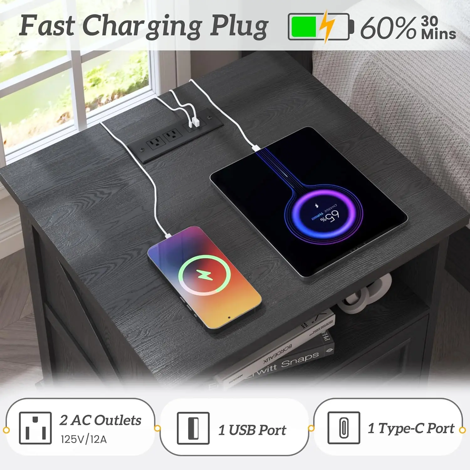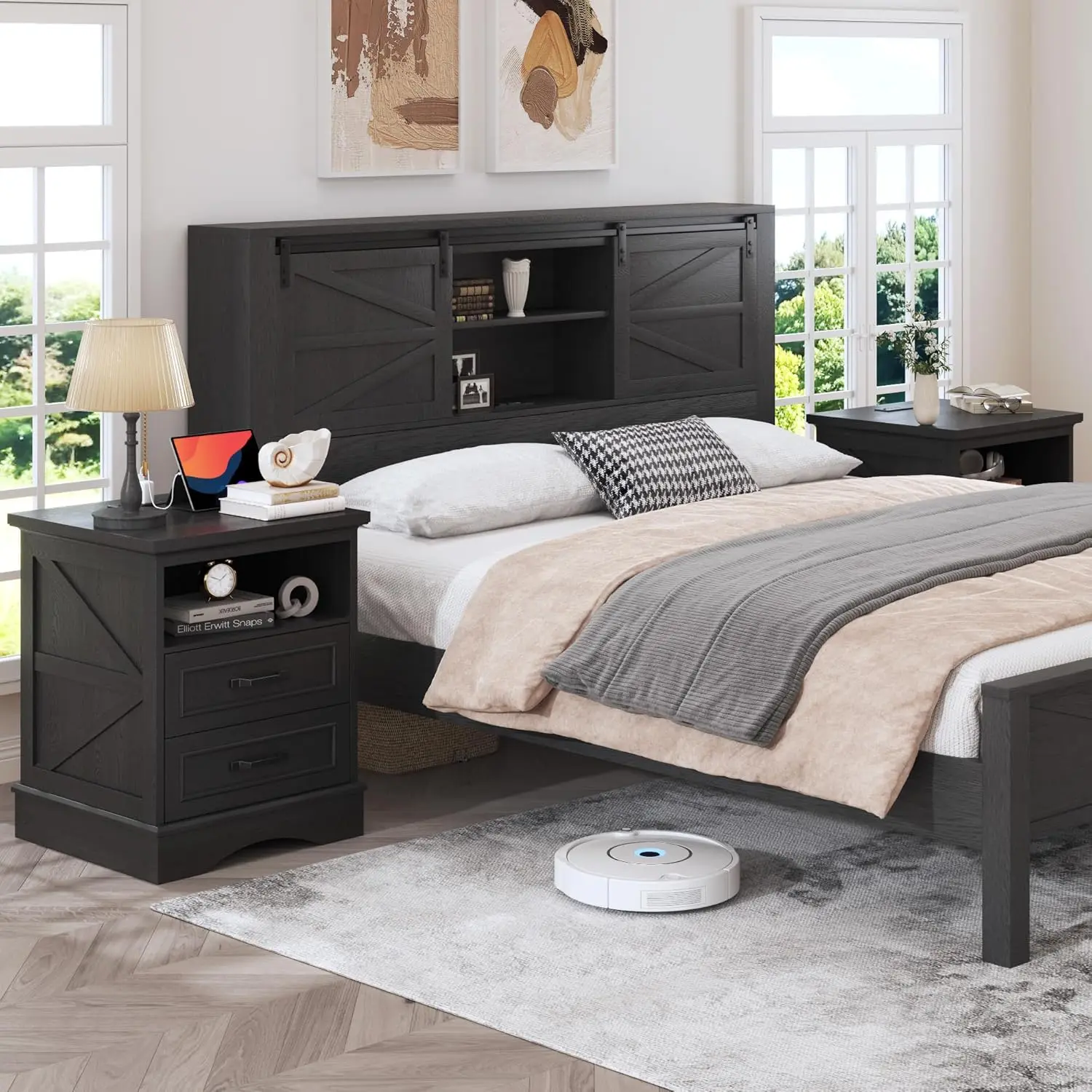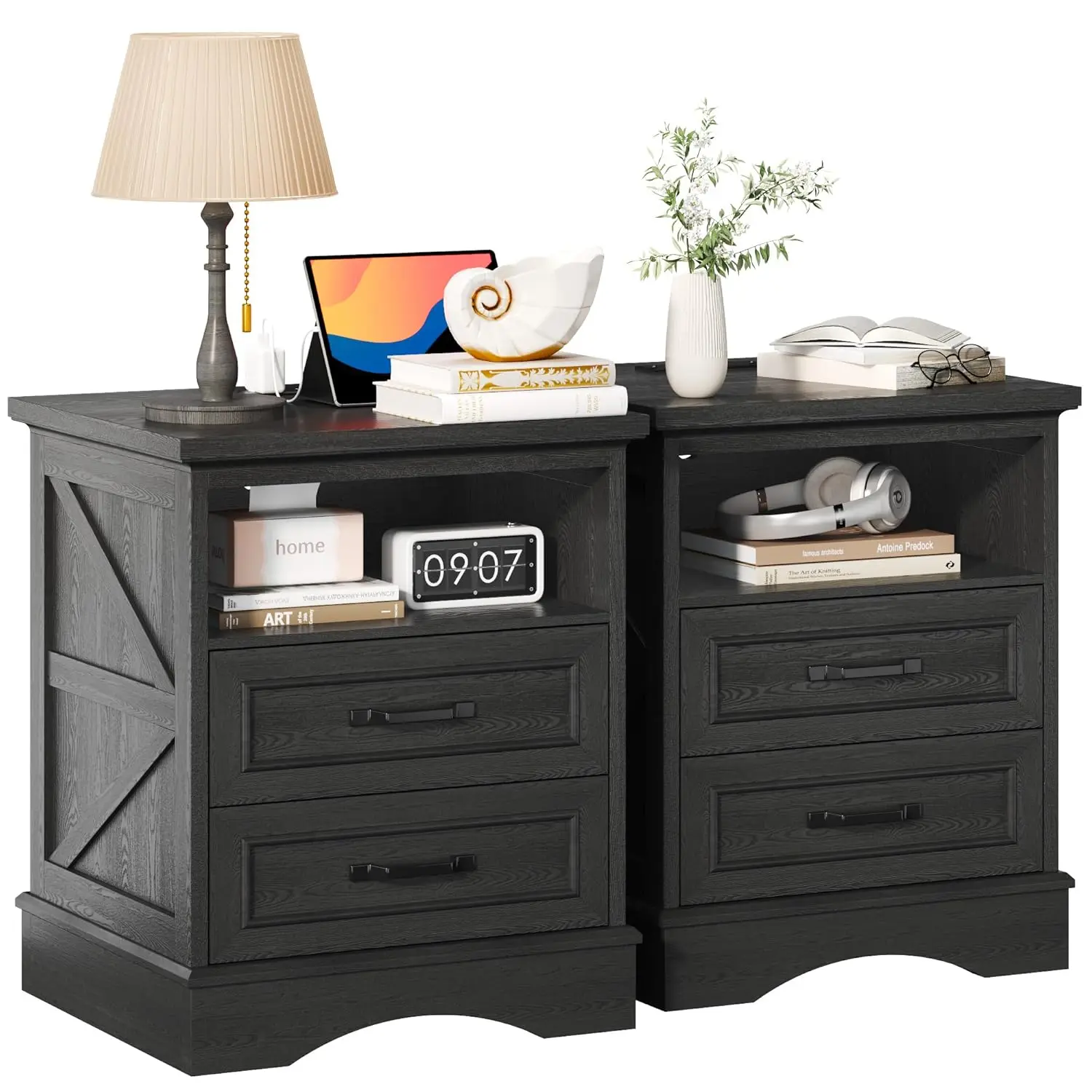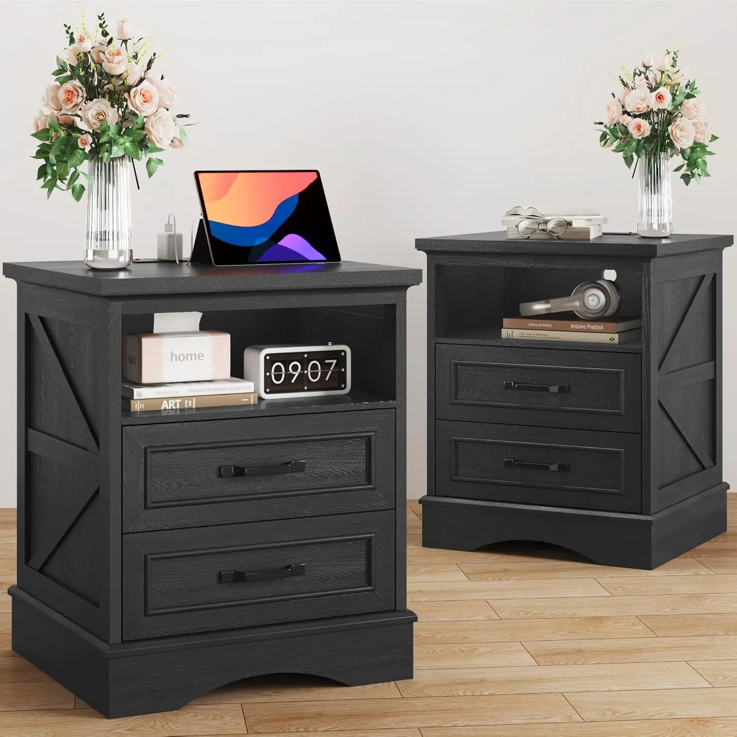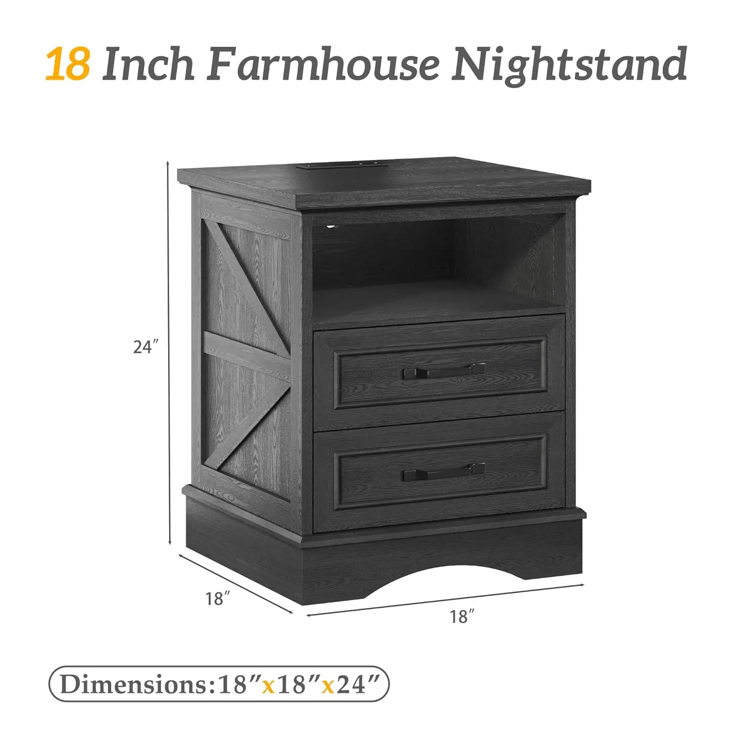 This 24-inch tall farmhouse nightstand set combines rustic charm with modern convenience. Designed as a set of two, it creates a cohesive and balanced bedroom look. Each nightstand features built-in fast charging ports for effortless device charging. The spacious drawers provide practical storage for bedside essentials. Its warm wood finish enhances the inviting farmhouse aesthetic. Perfect for bedrooms, it keeps electronics and personal items neatly organized. The sturdy construction ensures durability and long-term reliability. The integrated charging station eliminates clutter from extra cords and adapters. Its versatile design blends beautifully with farmhouse and transitional interiors. This nightstand set is a smart and stylish furniture choice that merges classic design with everyday functionality.