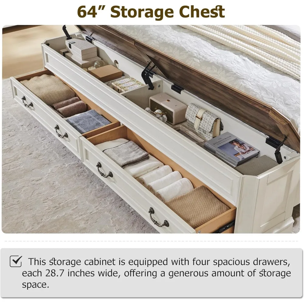 This farmhouse queen storage bed blends rustic charm with practical organization. Crafted from wood with a warm finish, it brings natural character to your bedroom. The sturdy platform design provides reliable mattress support without a box spring. A matching 64-inch storage chest with four large drawers adds generous space for linens and clothing. The headboard enhances comfort while creating a timeless focal point. Its farmhouse-inspired details complement country and modern rustic interiors. The built-in storage bench keeps essentials neatly tucked away. Designed for durability, it ensures long-lasting strength and stability. The cohesive design creates a balanced and inviting bedroom layout. This queen bed set is a stylish and functional solution that elevates comfort, storage, and classic farmhouse appeal.