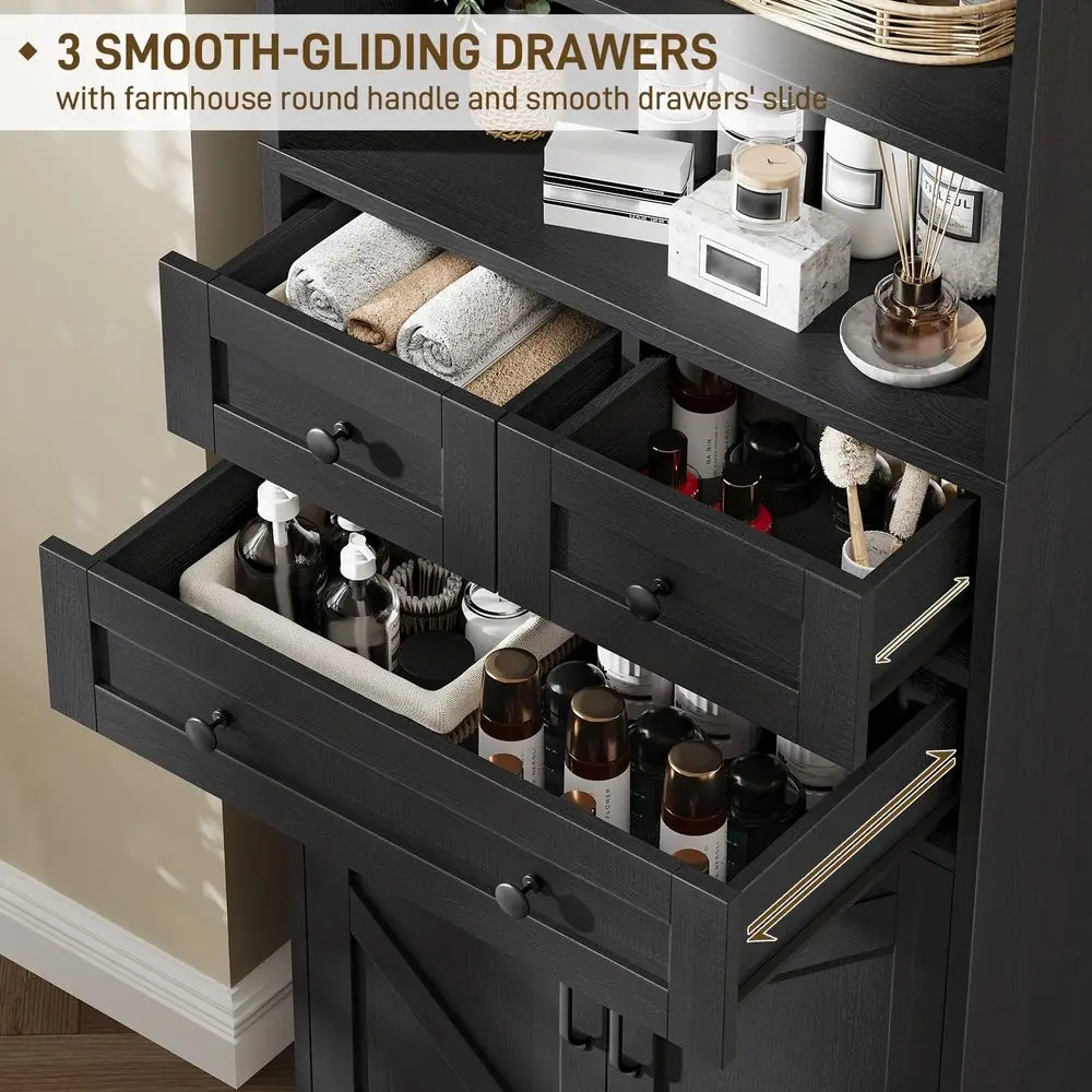 This farmhouse tall bathroom cabinet blends rustic charm with practical storage. Standing at 70 inches, it offers generous vertical space for organizing essentials. Designed with three drawers and adjustable shelves, it provides flexible storage options. The cabinet doors keep items neatly concealed for a clean look. Its warm wood finish adds natural texture and farmhouse character. Perfect for bathrooms, it helps keep toiletries and supplies organized. The multi-tier design enhances both function and accessibility. Crafted for durability, it ensures long-lasting performance and stability. Its timeless style complements farmhouse and modern interiors alike. This cabinet is a stylish and functional addition that elevates organization and home decor.