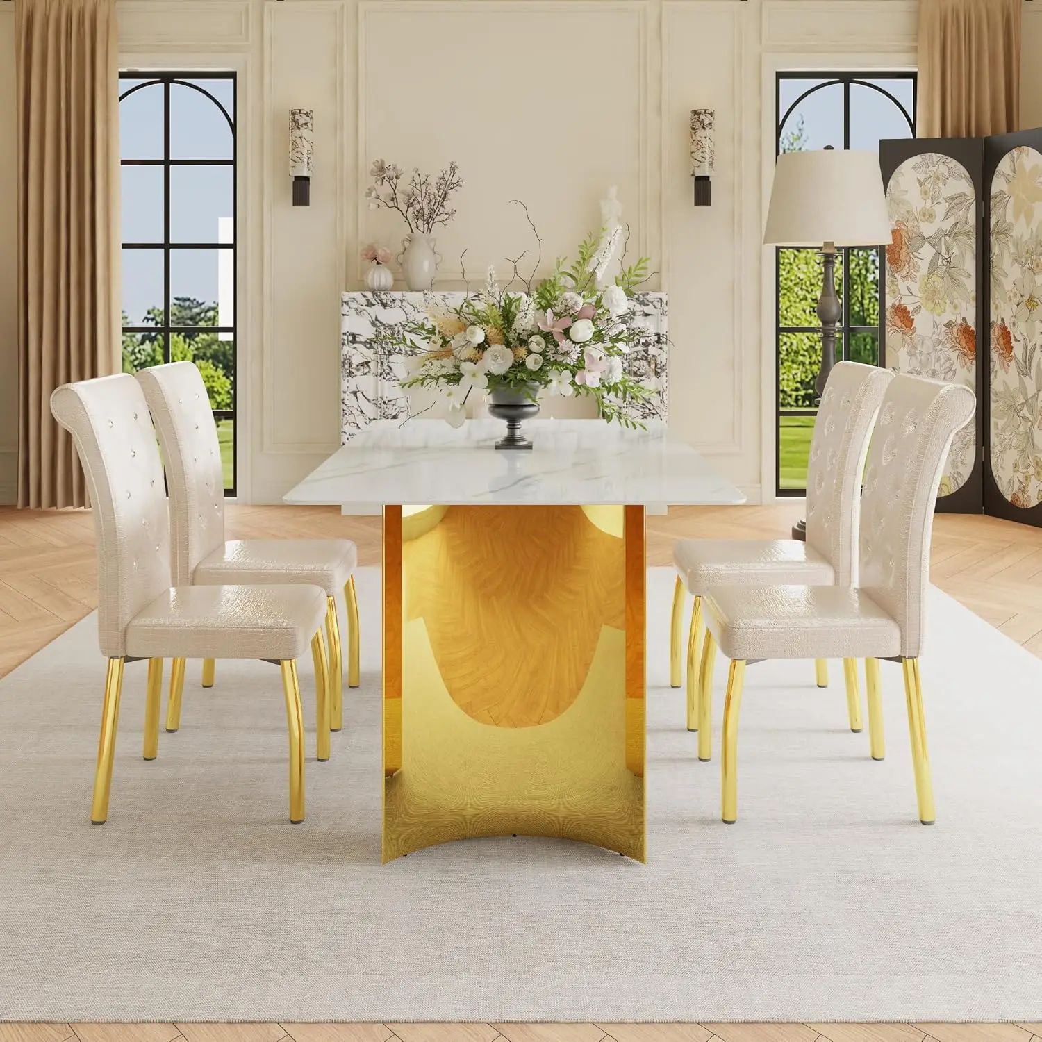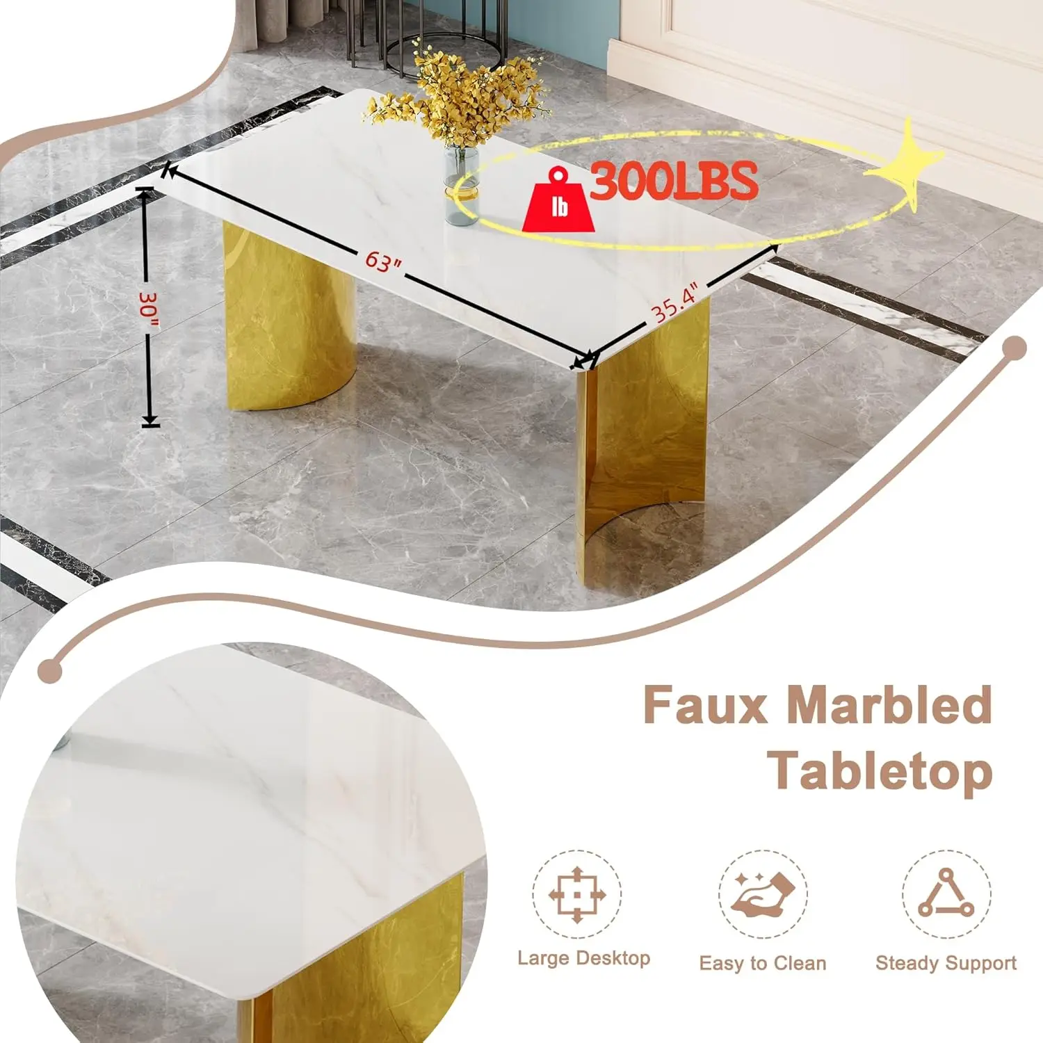 This faux marble dining set combines modern elegance with everyday functionality. Featuring a 63-inch white faux marble tabletop, it creates a bright and sophisticated centerpiece. The smooth surface is easy to clean and maintain. Four PU leather chairs provide comfortable seating with a sleek, modern look. The metal frame adds durability and a contemporary edge. Perfect for dining rooms or kitchens, it fits well in both compact and open spaces. Its clean design complements modern and minimalist interiors effortlessly. Crafted for stability, it ensures long-lasting performance. The combination of marble texture and metal accents adds refined style. This dining set is a practical and stylish addition that enhances both comfort and home decor.