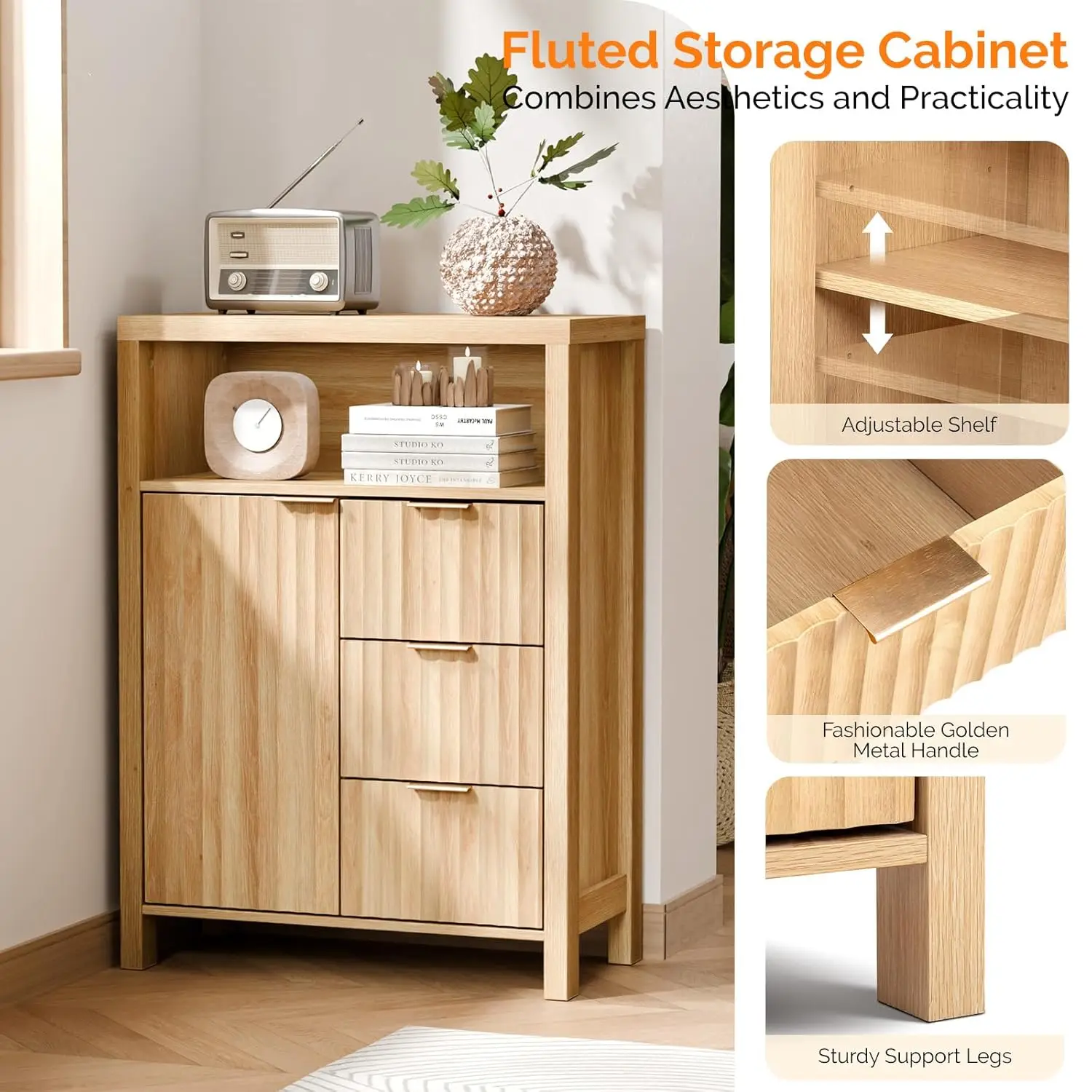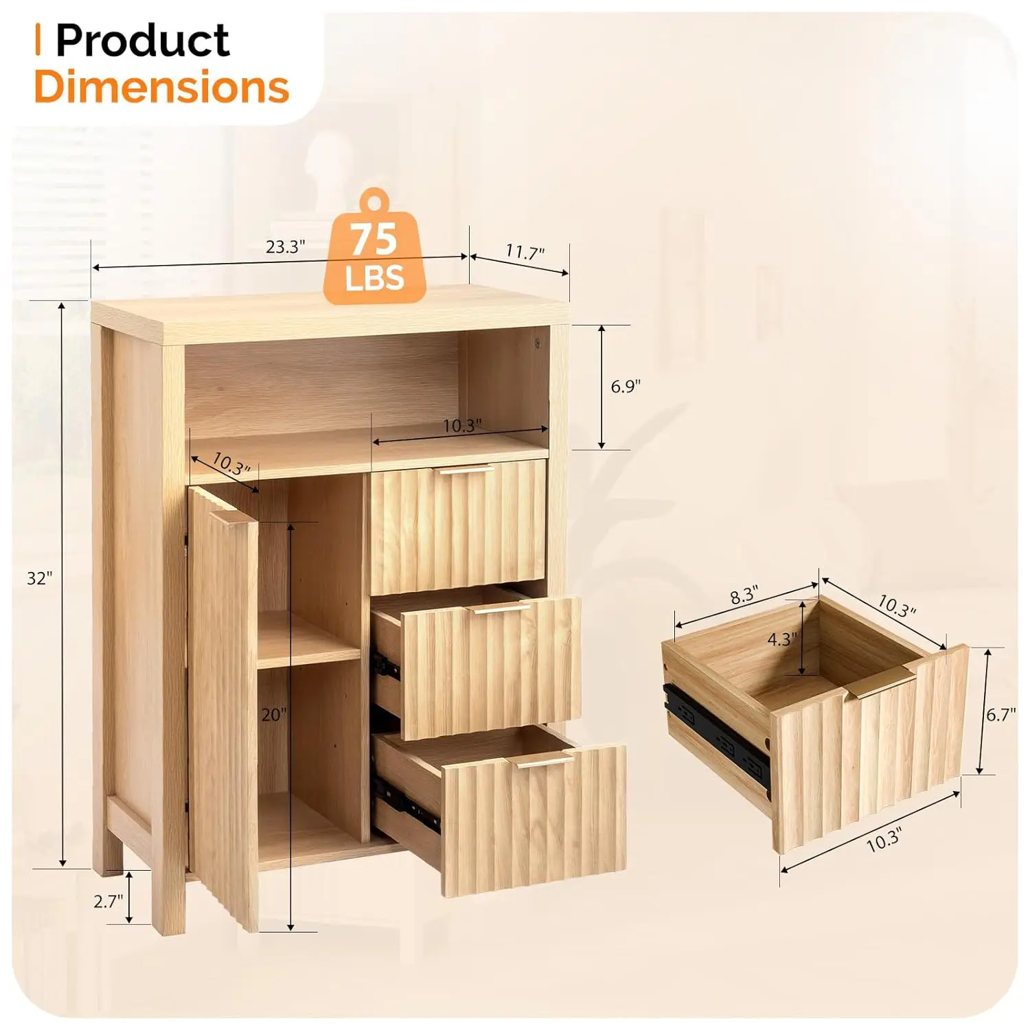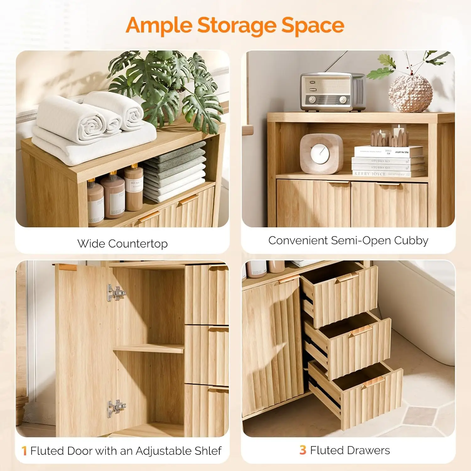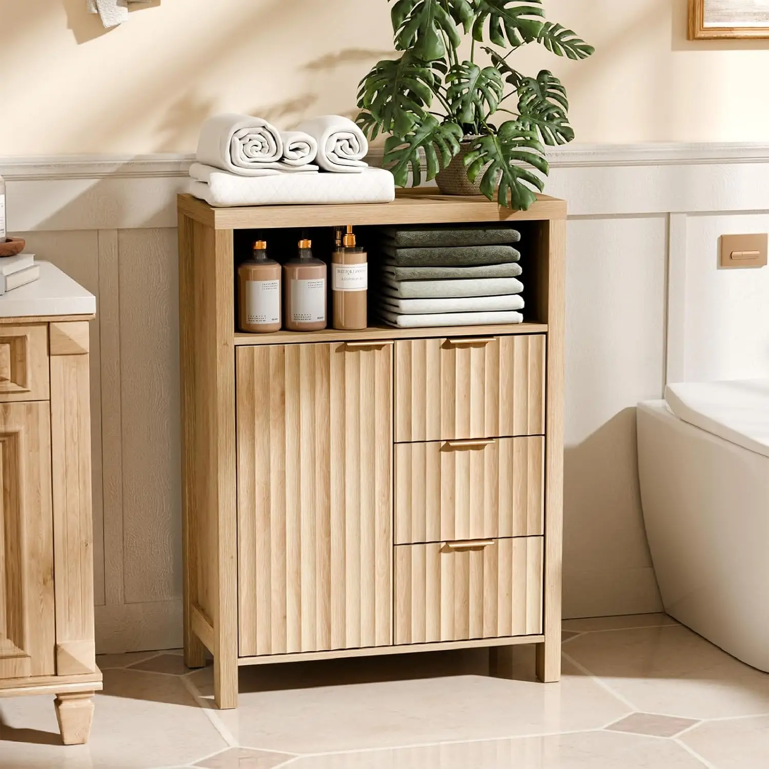 This fluted bathroom storage cabinet combines modern design with practical organization. Featuring a textured fluted door, it adds depth and visual interest to your space. Three drawers provide convenient storage for toiletries and essentials. Its 12-inch deep profile makes it ideal for compact bathrooms. The floor-standing design offers stability while maximizing vertical storage. Perfect for keeping your space tidy, it blends functionality with style. The modern aesthetic complements contemporary interiors effortlessly. Crafted for durability, it ensures reliable everyday use. The combination of closed storage and drawers enhances organization. This cabinet is a stylish and space-saving solution that elevates your bathroom decor and storage.