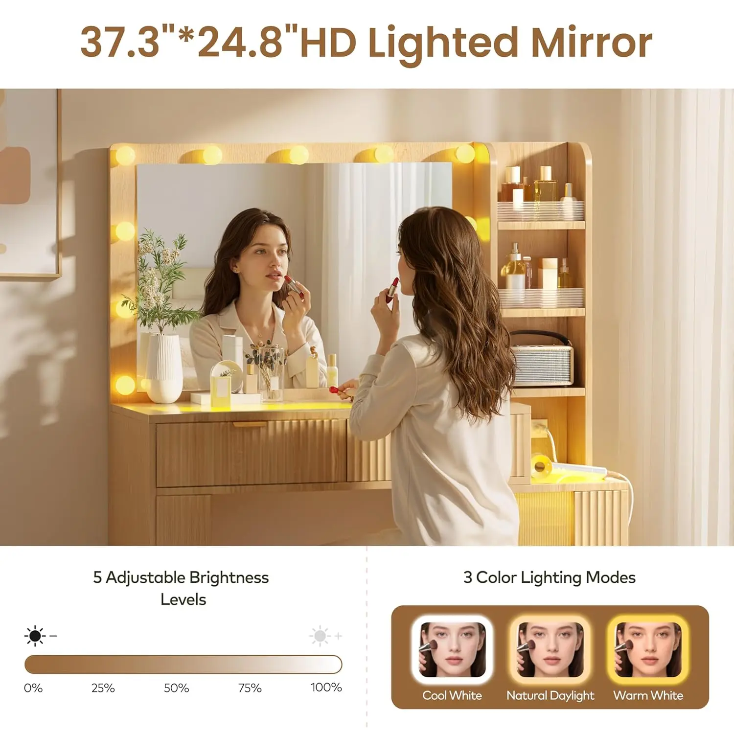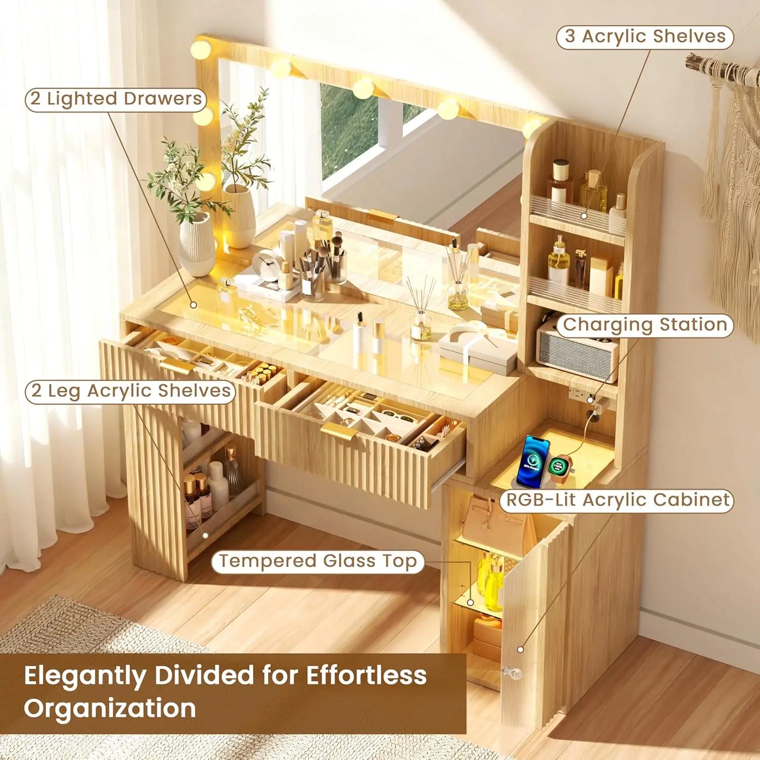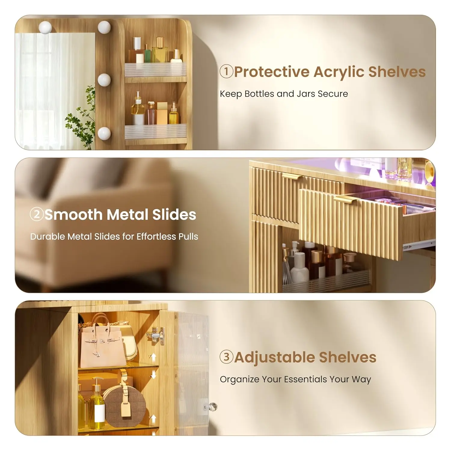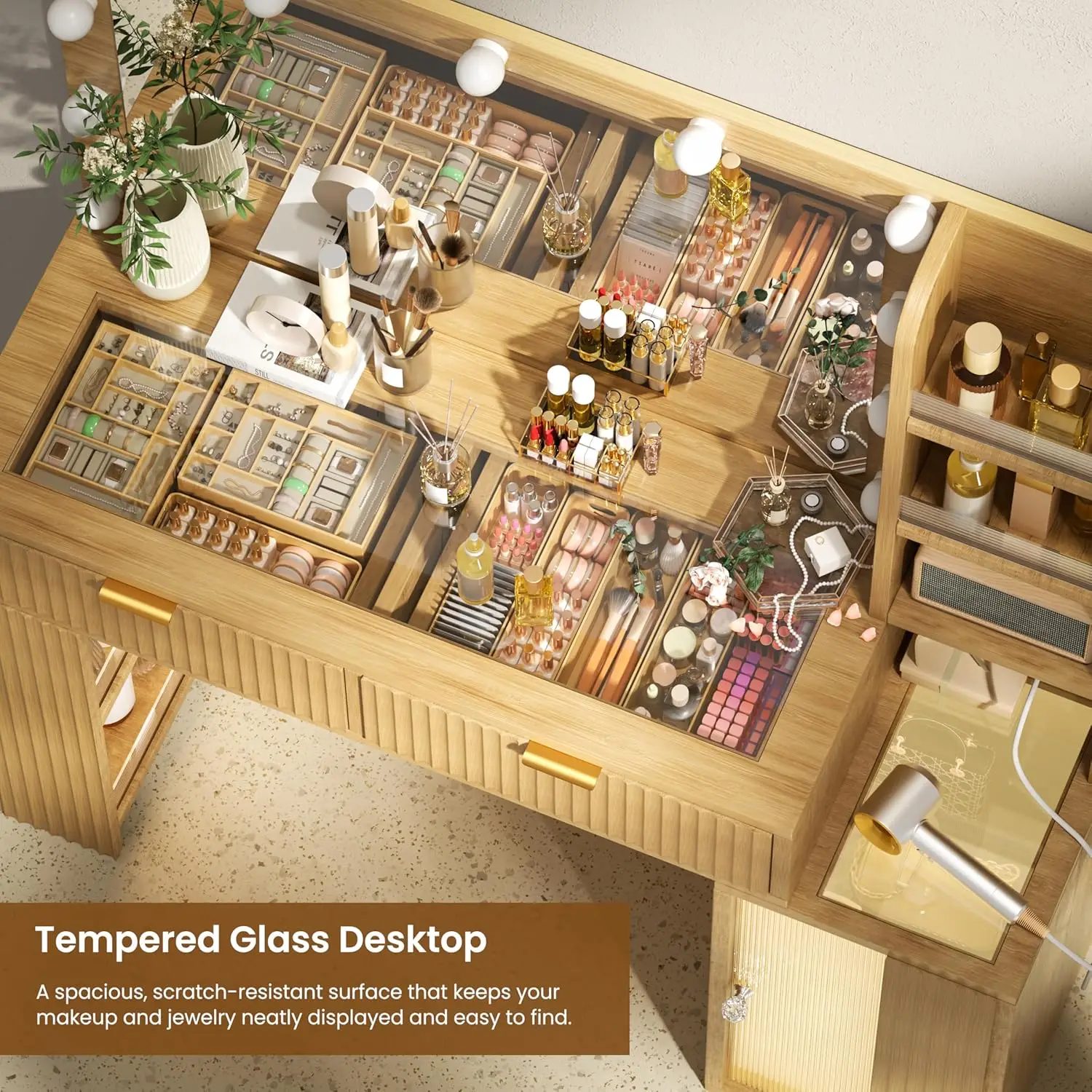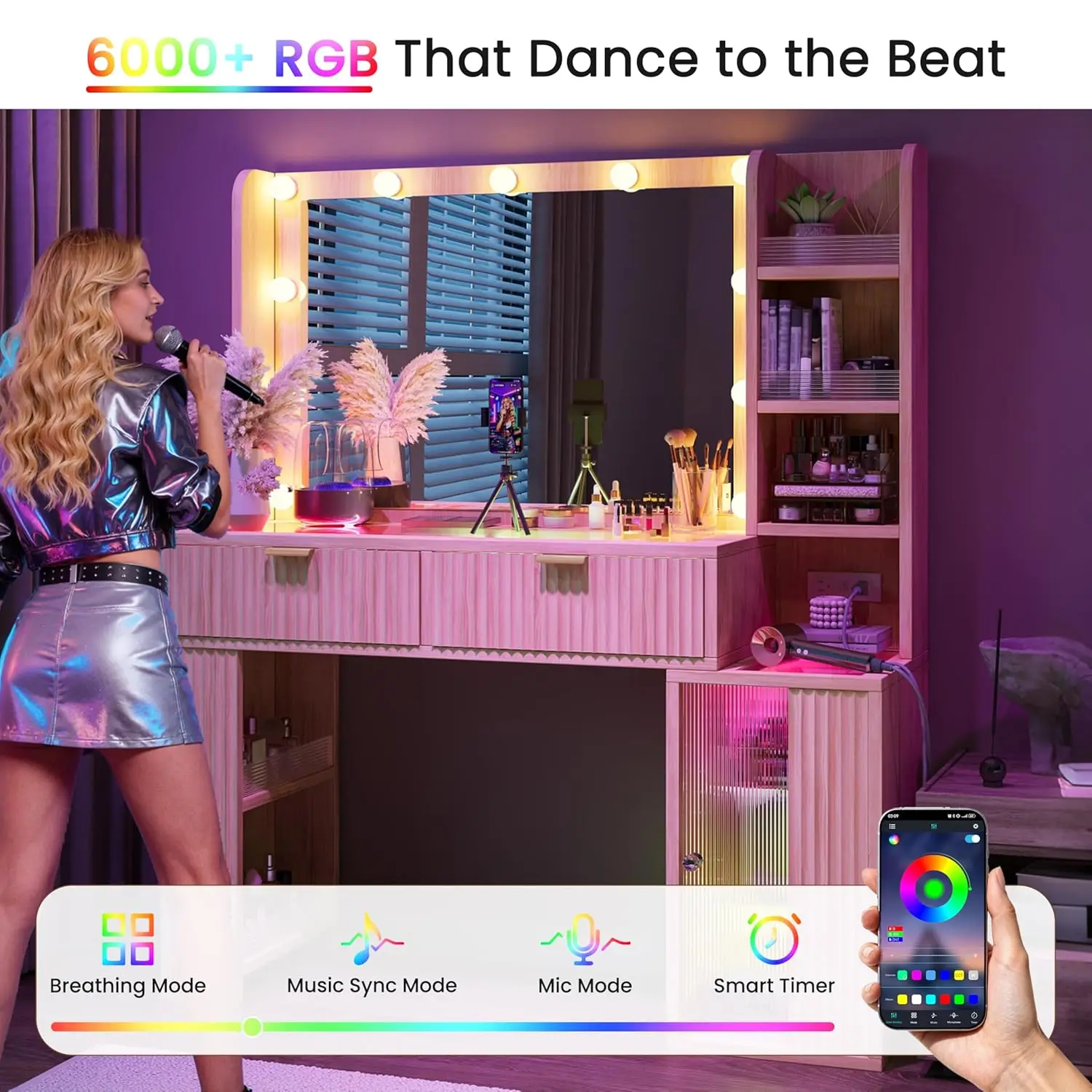 This 47-inch fluted makeup vanity desk blends modern elegance with smart functionality. Featuring a large 36-inch mirror framed with Hollywood-style bulbs, it delivers professional-level illumination. The integrated smart RGB lighting allows customizable color settings to match your mood. Its glass top surface adds a sleek and sophisticated touch. Designed with ample storage space, it keeps cosmetics and essentials neatly organized. The fluted detailing enhances texture and visual interest. Perfect for bedrooms, it creates a dedicated and stylish beauty station. The balanced lighting ensures clarity for makeup application and grooming. Crafted for durability, it combines aesthetic appeal with practical design. This vanity desk is a glamorous and functional centerpiece that elevates your daily routine with modern luxury.