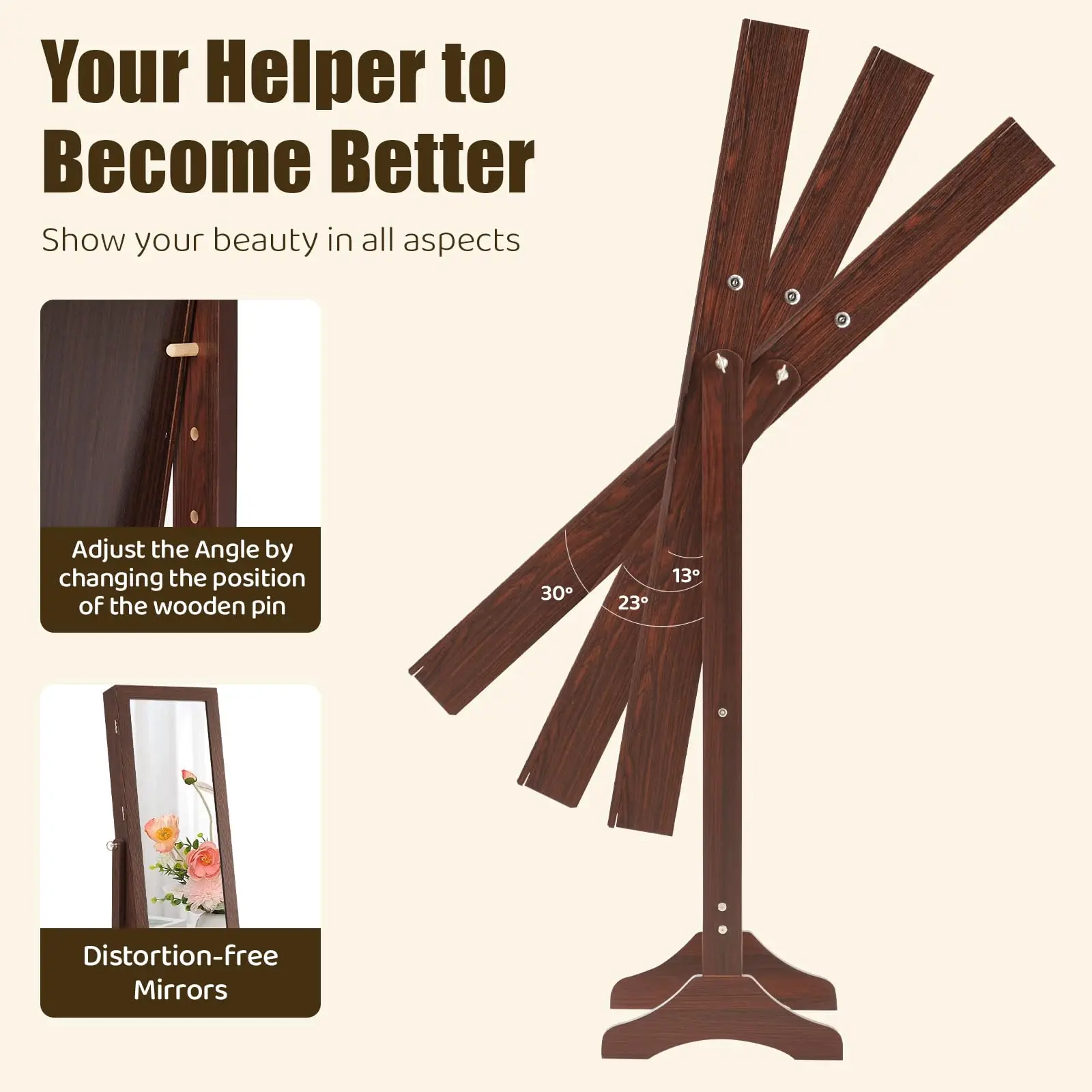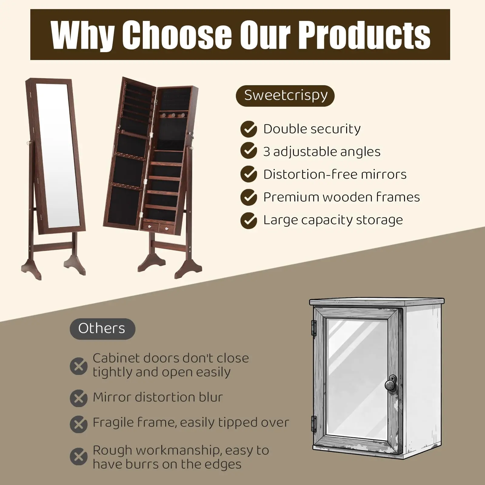 This full-length jewelry armoire combines elegant design with smart organization. Featuring a tall standing mirror, it allows you to check your outfit while keeping accessories neatly stored. The spacious interior includes dedicated compartments for necklaces, rings, earrings, and bracelets. Designed as a makeup and jewelry organizer, it keeps essentials easily accessible. Its freestanding structure makes placement simple in bedrooms or dressing areas. The sleek exterior complements modern and contemporary decor styles. With ample storage space, it helps reduce clutter and maintain order. The mirror surface brightens the room while adding functional value. Crafted for stability and durability, it offers reliable everyday use. This jewelry armoire is a stylish and practical solution for organized living with refined charm.