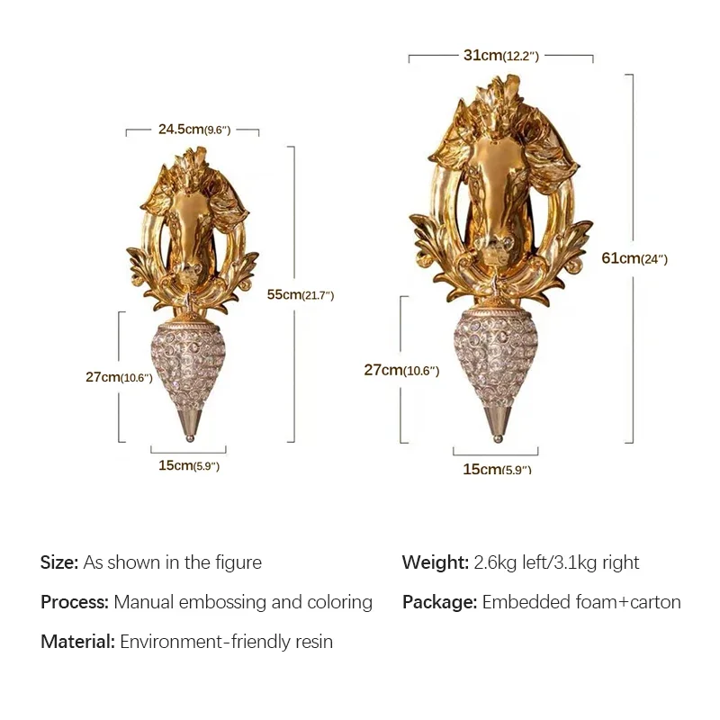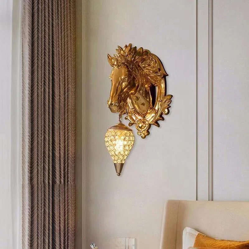 This gold horse wall lamp blends artistic design with modern LED illumination. Crafted with a detailed resin horse figure, it creates a bold and creative focal point. The gold finish adds a luxurious and eye-catching touch to any interior. Its LED lighting provides energy-efficient and soft illumination. Perfect for living rooms, it enhances decor with a unique artistic statement. In bedrooms, it offers ambient lighting with distinctive character. The wall-mounted design keeps spaces clean while adding visual interest. Its contemporary style complements modern and eclectic interiors effortlessly. Built for durability, it ensures long-lasting performance and stability. This wall lamp is a striking decor piece that combines art, light, and luxury in one elegant design.