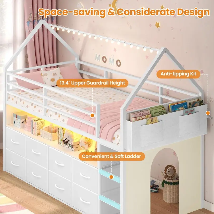 This twin size house loft bed combines playful design with smart storage solutions. Featuring a charming house-shaped frame, it adds imagination and character to any child’s bedroom. Built with sturdy metal construction, it offers reliable strength and stability. The integrated LED lights create a fun and cozy atmosphere. Eight spacious storage drawers help keep toys, clothes, and essentials organized. The built-in bookcase provides convenient space for books and decor. A soft foam-covered ladder enhances comfort and safety while climbing. Its elevated loft design maximizes floor space for play or study areas. Designed with safety in mind, it ensures a secure and supportive sleep environment. This multifunction loft bed is a creative and practical centerpiece that transforms your child’s room into a stylish and organized retreat.