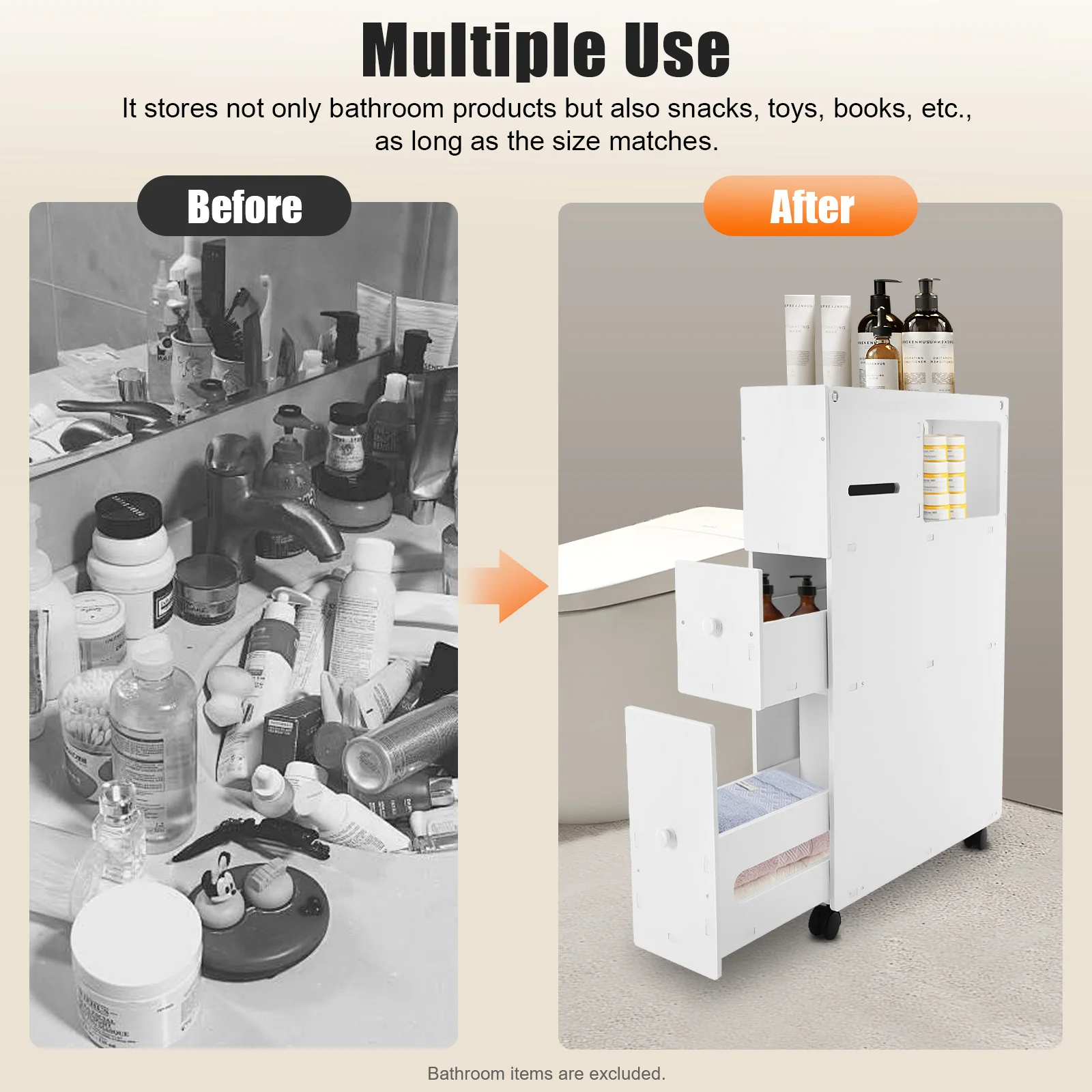 This narrow wheeled storage cabinet offers flexible organization for compact spaces. Designed with a slim profile, it fits easily into tight areas like bathrooms, kitchens, or bedrooms. The wheeled base allows smooth movement and convenient repositioning. A lockable drawer provides secure storage for personal items. Crafted from durable PVC, it resists moisture and is easy to maintain. Perfect for organizing toiletries, supplies, or household essentials. Its space-saving design helps reduce clutter while maximizing storage. The multi-tier structure enhances accessibility and organization. Its clean and modern look complements a variety of interiors. This cabinet is a practical and versatile solution that improves storage and convenience in your home.