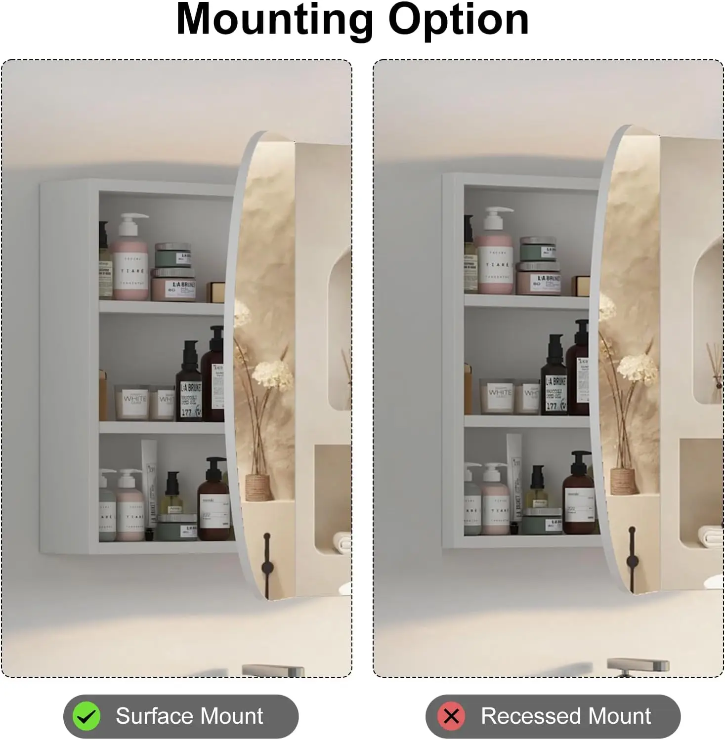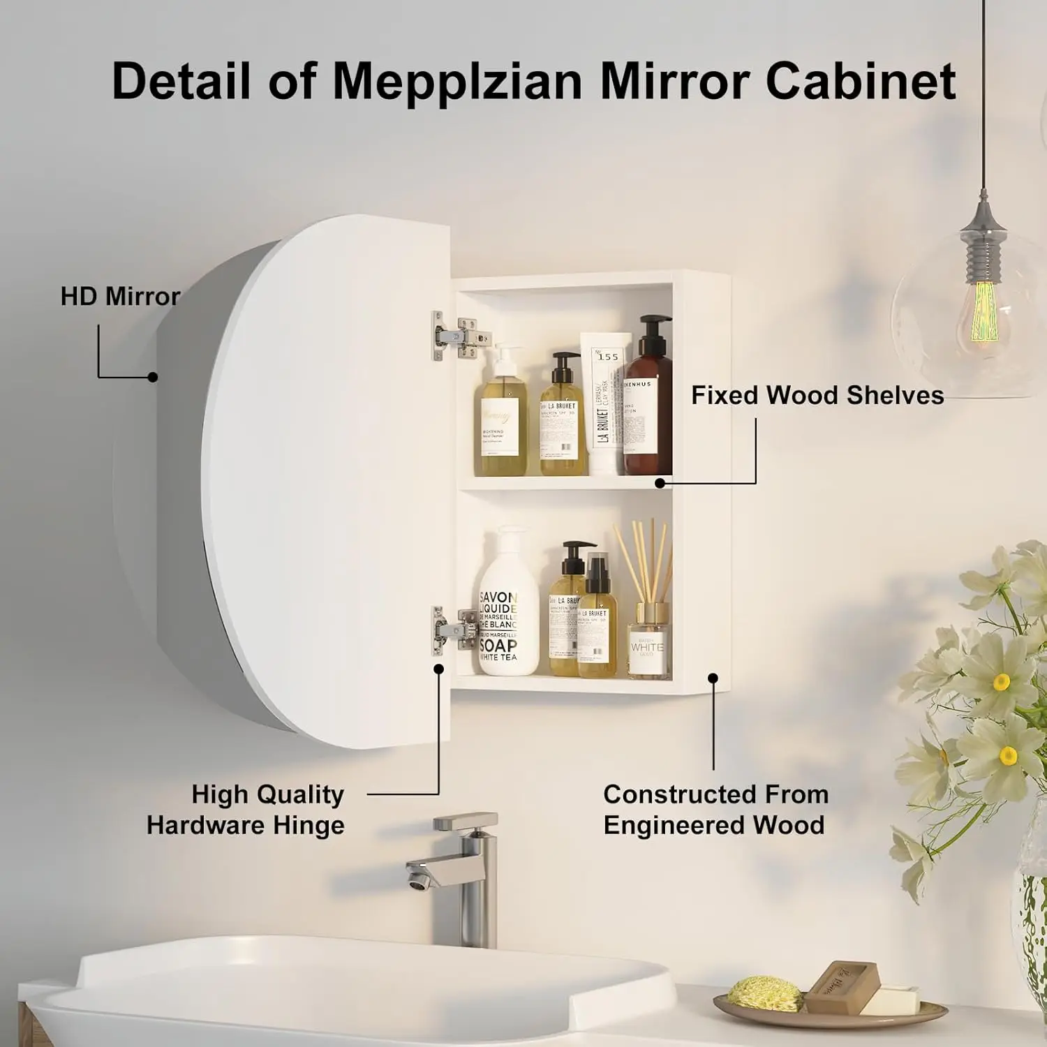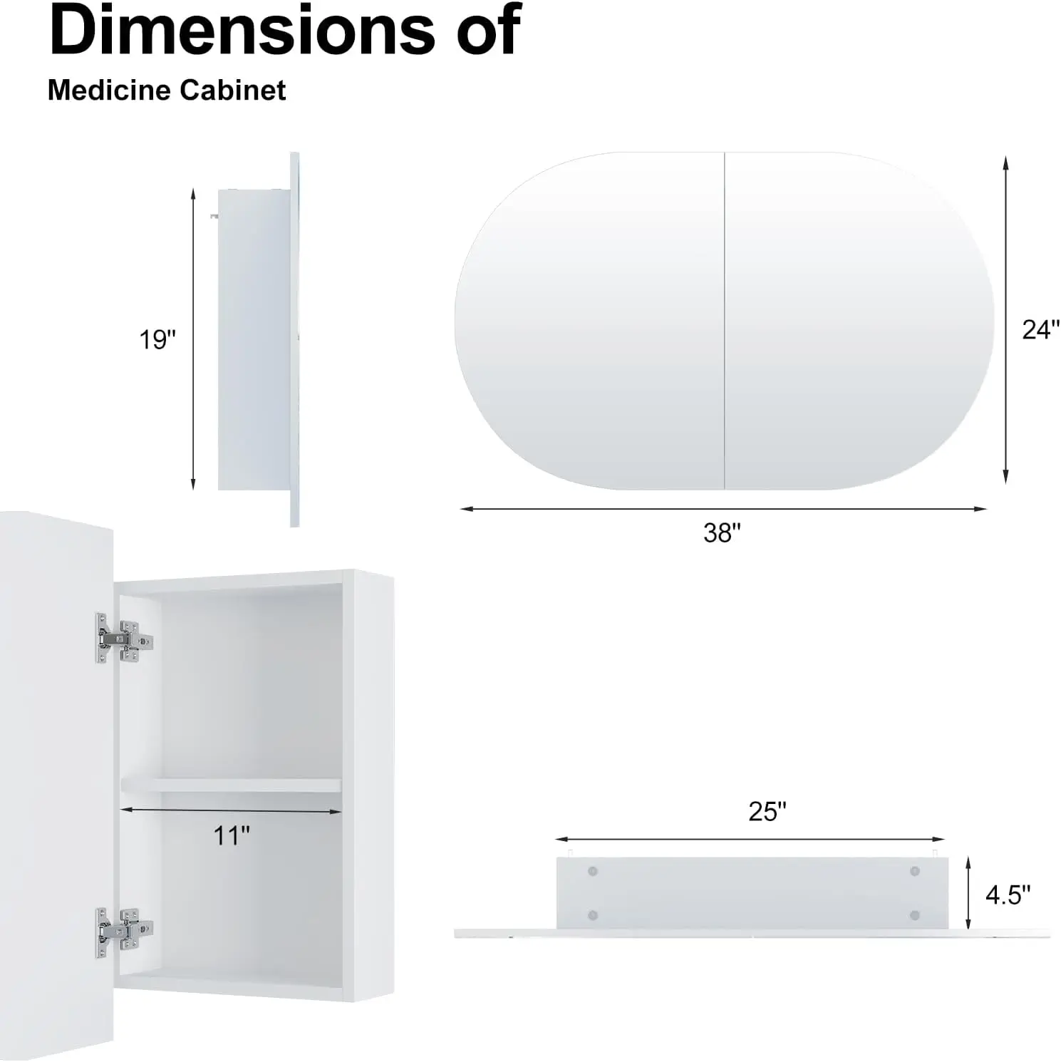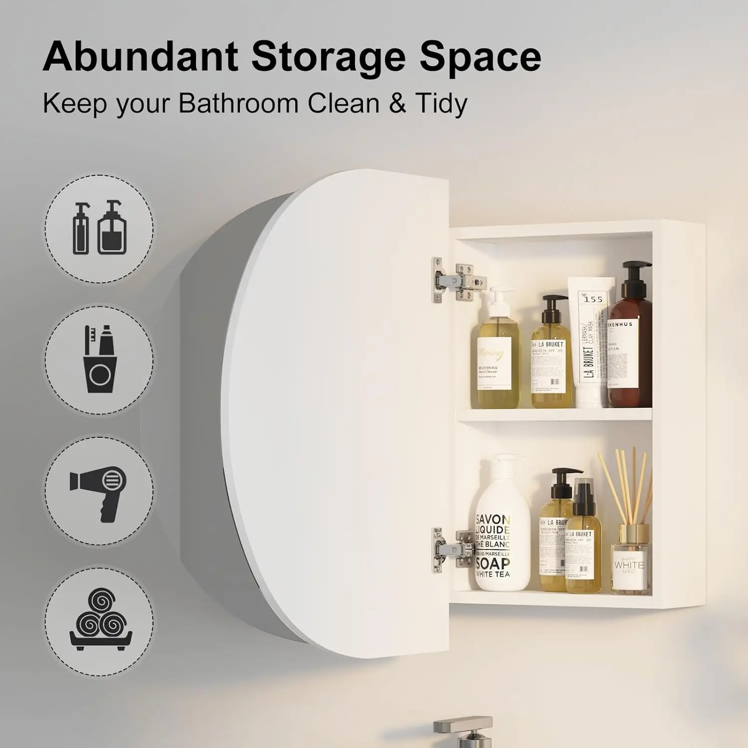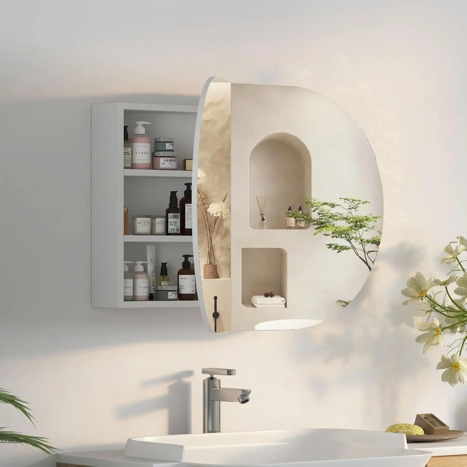 This oval medicine cabinet mirror combines soft design with practical bathroom storage. Featuring a white finish, it adds a clean and refreshing look to your space. The oval mirror creates a smooth and modern aesthetic. Inside, three storage sections provide organized space for toiletries and essentials. The wall-mounted design helps save space while maintaining a neat appearance. Perfect for bathrooms, it offers both functionality and decorative appeal. The reflective surface enhances light and creates a more open feel. Its minimalist style complements contemporary and transitional interiors effortlessly. Crafted for durability, it ensures reliable everyday use. This medicine cabinet is a stylish and efficient solution that enhances organization and modern bathroom design.