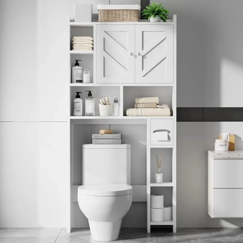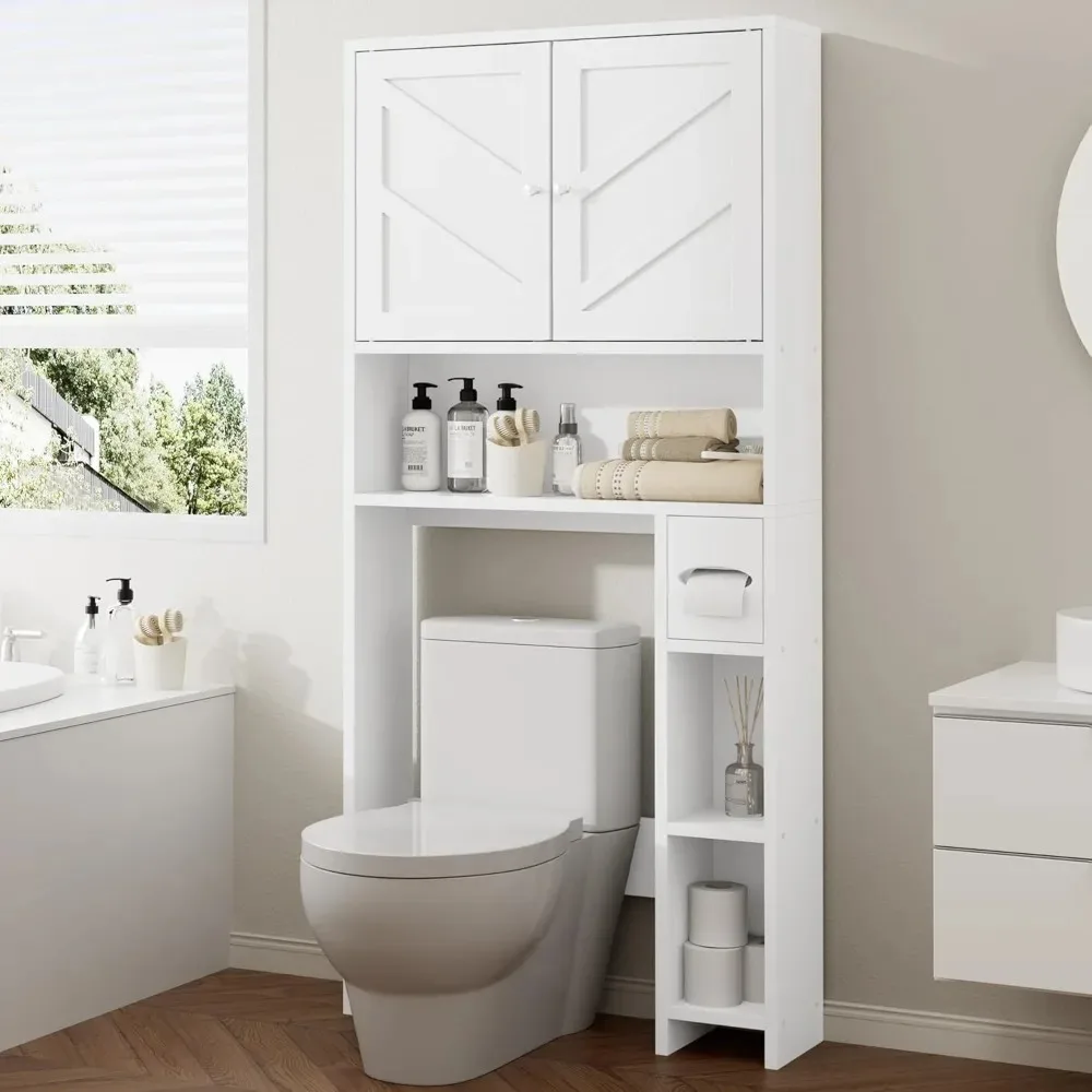 This over-toilet storage organizer combines smart design with everyday convenience. Featuring a built-in toilet paper holder, it adds functionality while keeping essentials within reach. The freestanding structure fits neatly over most toilets, maximizing vertical space. Multiple storage sections provide room for toiletries, towels, and bathroom supplies. Perfect for small bathrooms, it helps reduce clutter and improve organization. Its compact design makes efficient use of limited space. Crafted for durability, it ensures reliable everyday performance. The clean and modern style complements a variety of interiors. Easy to assemble and position, it offers flexible use. This cabinet is a practical and stylish solution that enhances bathroom organization and convenience.