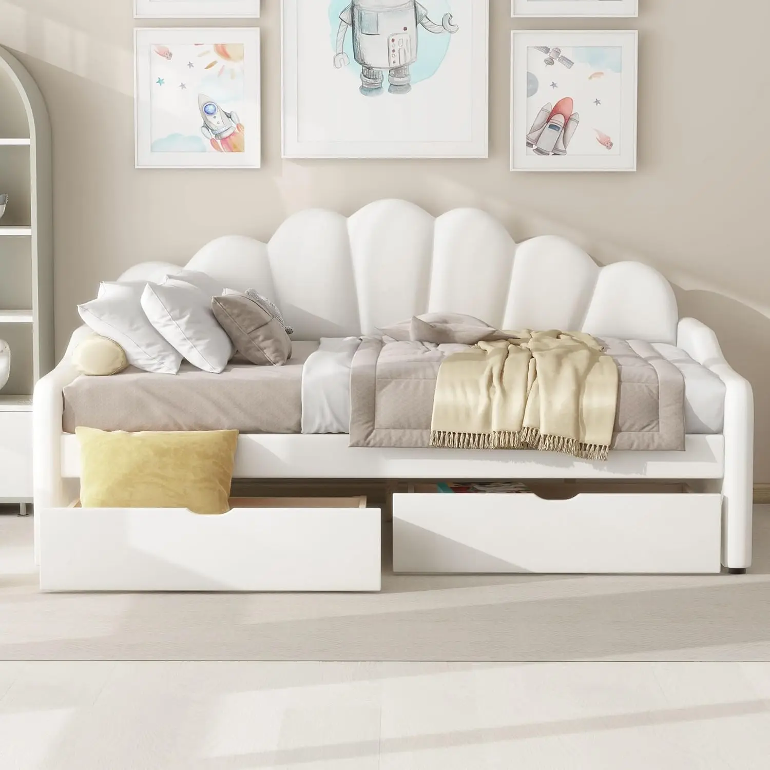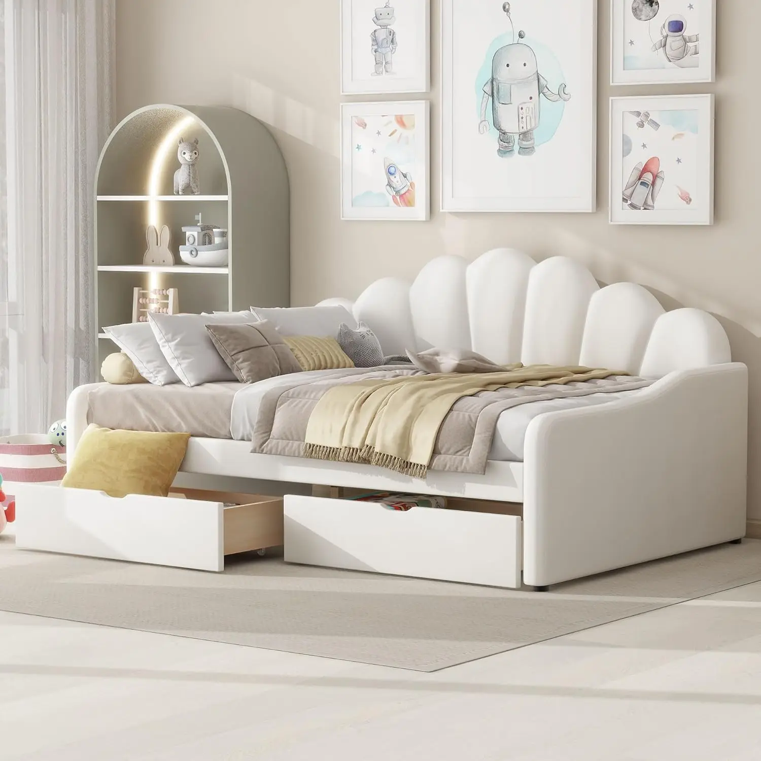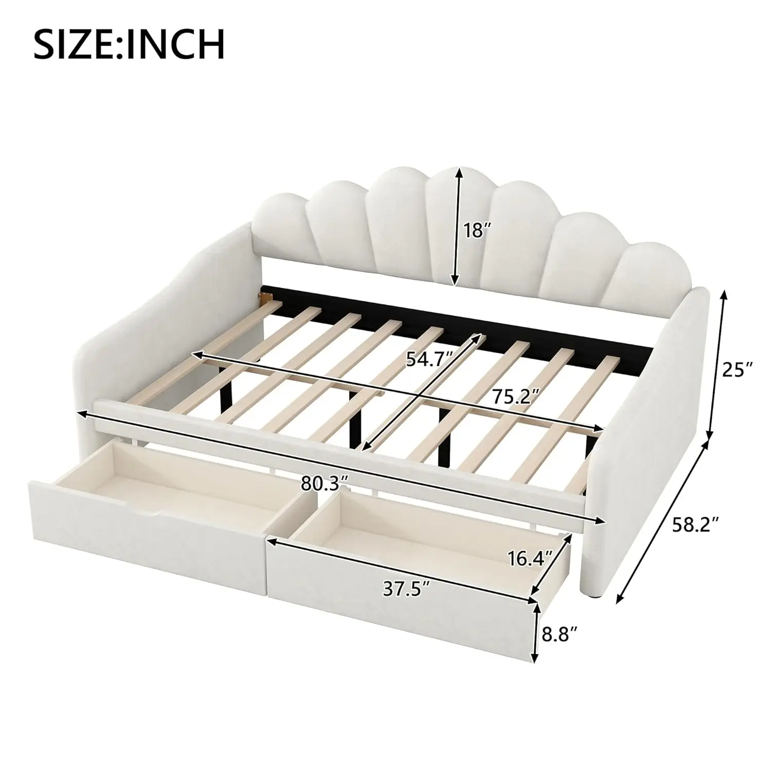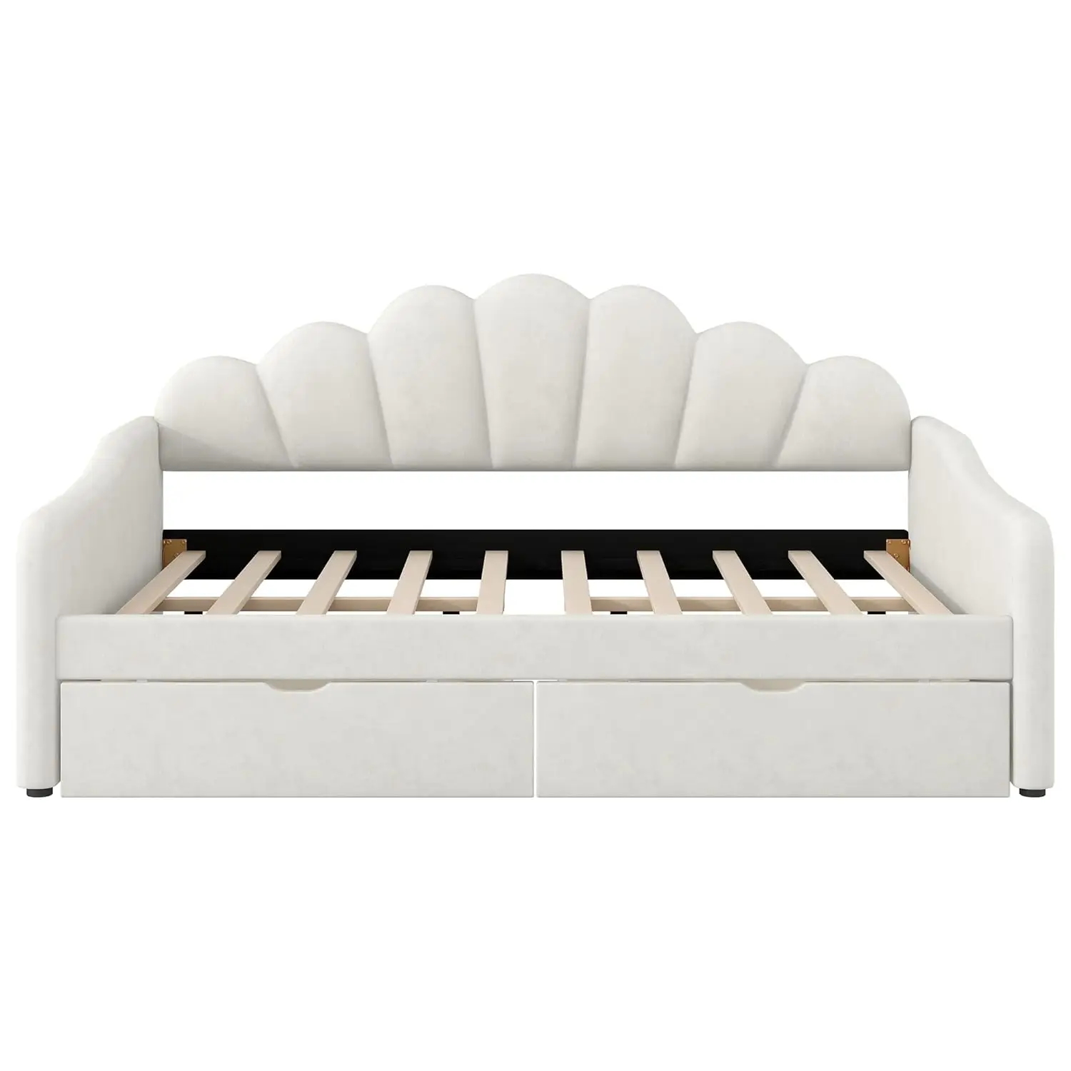 This wooden full size corner daybed blends elegant design with practical storage. Upholstered in soft velvet, it adds a luxurious and inviting texture. The shell-shaped backrest creates a distinctive and stylish focal point. Designed for corner placement, it maximizes floor space efficiently. A built-in drawer provides convenient storage for bedding and essentials. Perfect for bedrooms or guest rooms, it offers versatile functionality. The sturdy wood frame ensures lasting durability and support. Its full-size layout provides comfortable lounging and sleeping space. The refined silhouette complements modern and contemporary interiors effortlessly. This daybed is a sophisticated and multifunctional piece that enhances comfort, organization, and bedroom style.