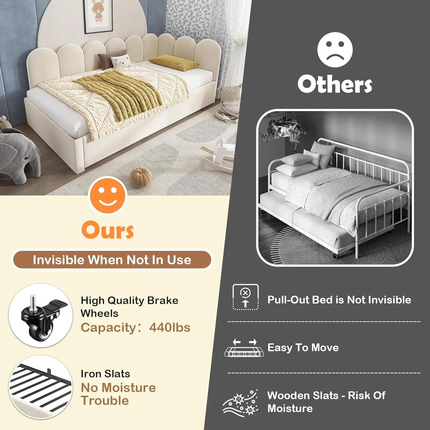 This velvet twin size daybed with trundle combines comfort and versatility in a stylish design. Upholstered in soft velvet, it adds a luxurious and cozy touch to any room. The L-shaped corner structure creates a modern and functional layout. Designed with a pull-out trundle, it easily accommodates overnight guests. The upholstered headboard enhances both comfort and visual appeal. Perfect for bedrooms or guest rooms, it maximizes space efficiently. Its compact design makes it ideal for apartments or multifunctional spaces. The sturdy frame ensures reliable support and long-lasting durability. The elegant silhouette blends effortlessly with contemporary interiors. This daybed is a refined and practical solution that elevates comfort, flexibility, and modern bedroom style.