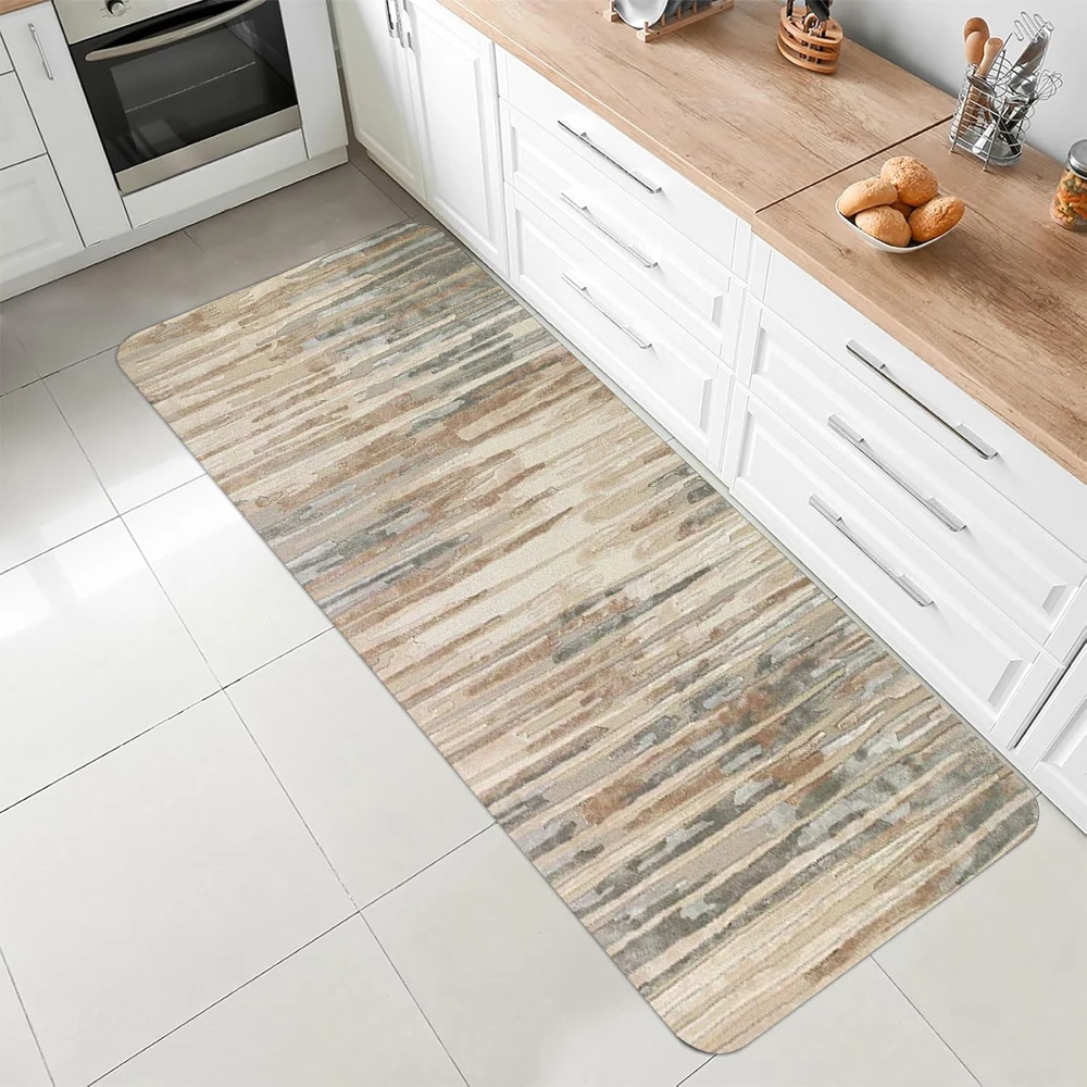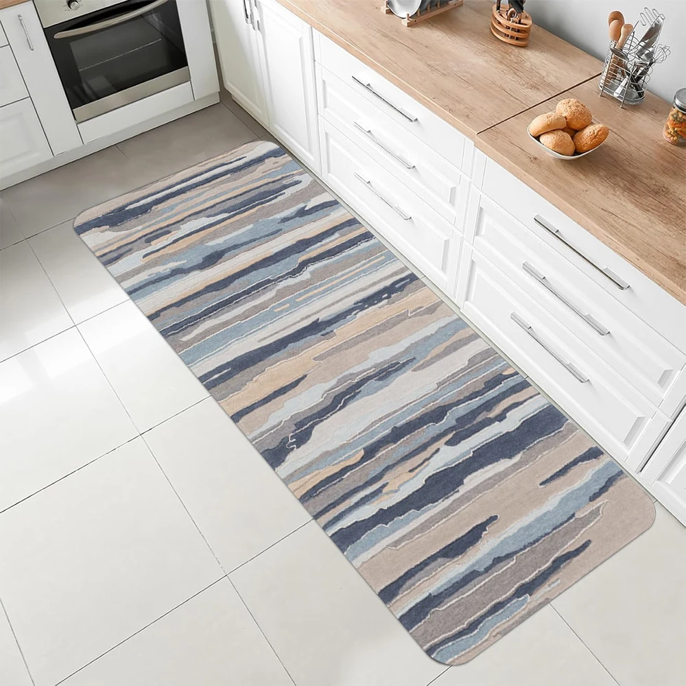 This watercolor striped runner rug brings soft color and modern artistry to your home. Designed with blended beige, blue, and gray tones, it creates a calm and stylish look. The abstract watercolor pattern adds movement and visual interest. Its long runner shape is perfect for kitchens, bathrooms, and hallways. The non-slip backing ensures stability and safety on various surfaces. The soft surface provides comfort underfoot for everyday use. Easy-to-clean material makes maintenance simple and convenient. Its contemporary design complements modern interiors effortlessly. Crafted for durability, it withstands daily wear while maintaining its appearance. This runner rug is a stylish and functional addition that enhances both comfort and home decor.