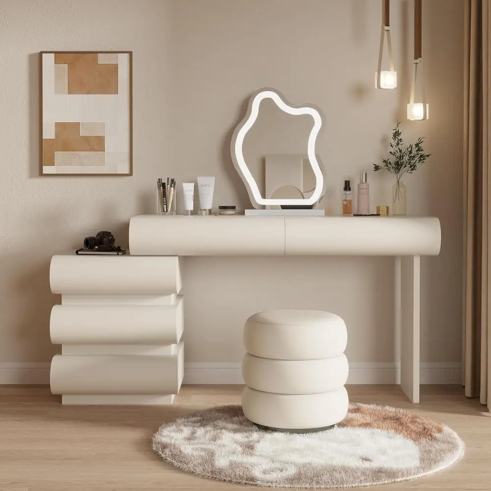 This elegant white leather vanity set combines luxury design with practical storage. Featuring an illuminated mirror, it provides clear and flattering lighting for daily routines. The leather-clad finish adds a refined and sophisticated texture. Five spacious drawers keep cosmetics and accessories neatly organized. The included stool offers comfortable seating with a coordinated look. Its 39.4-inch size makes it ideal for bedrooms of various dimensions. The sleek white finish brightens your space and enhances modern decor. Designed for both beauty and functionality, it creates a dedicated grooming station. The sturdy construction ensures durability and long-term reliability. This vanity desk set is a stylish and organized solution that elevates your bedroom with elegance and convenience.